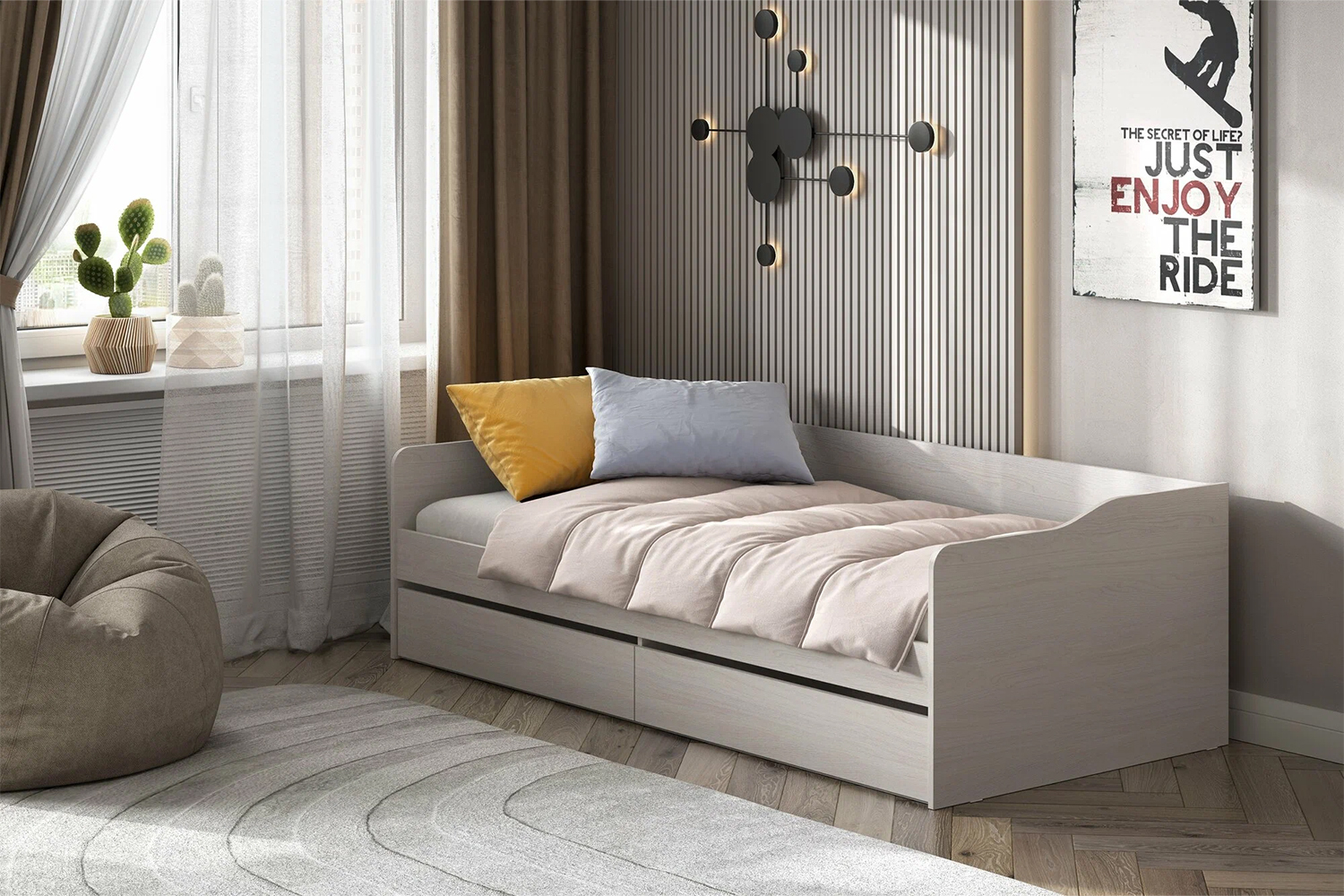 Надежная односпальная кровать из ЛДСП с ящиками. Выполнена в приятном древесном декоре "ясень анкор светлый". Два выкатных ящика подойдут для хранения постельного белья и личных вещей ребенка.