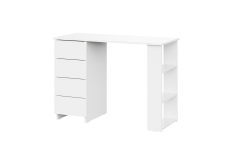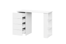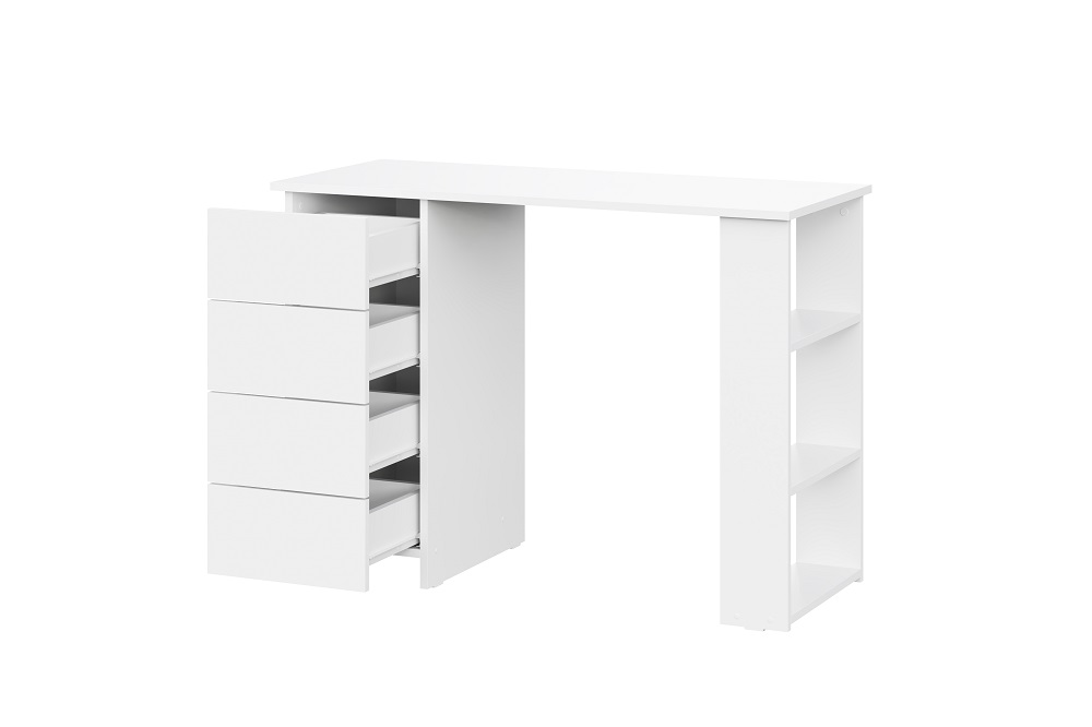 Конструкция стола обеспечивает стабильность и надёжность, а также позволяет организовать рабочее пространство максимально эффективно. Столешница опирается на ящики с одной стороны и имеет три открытые полки с другой, что добавляет удобства при использовании.