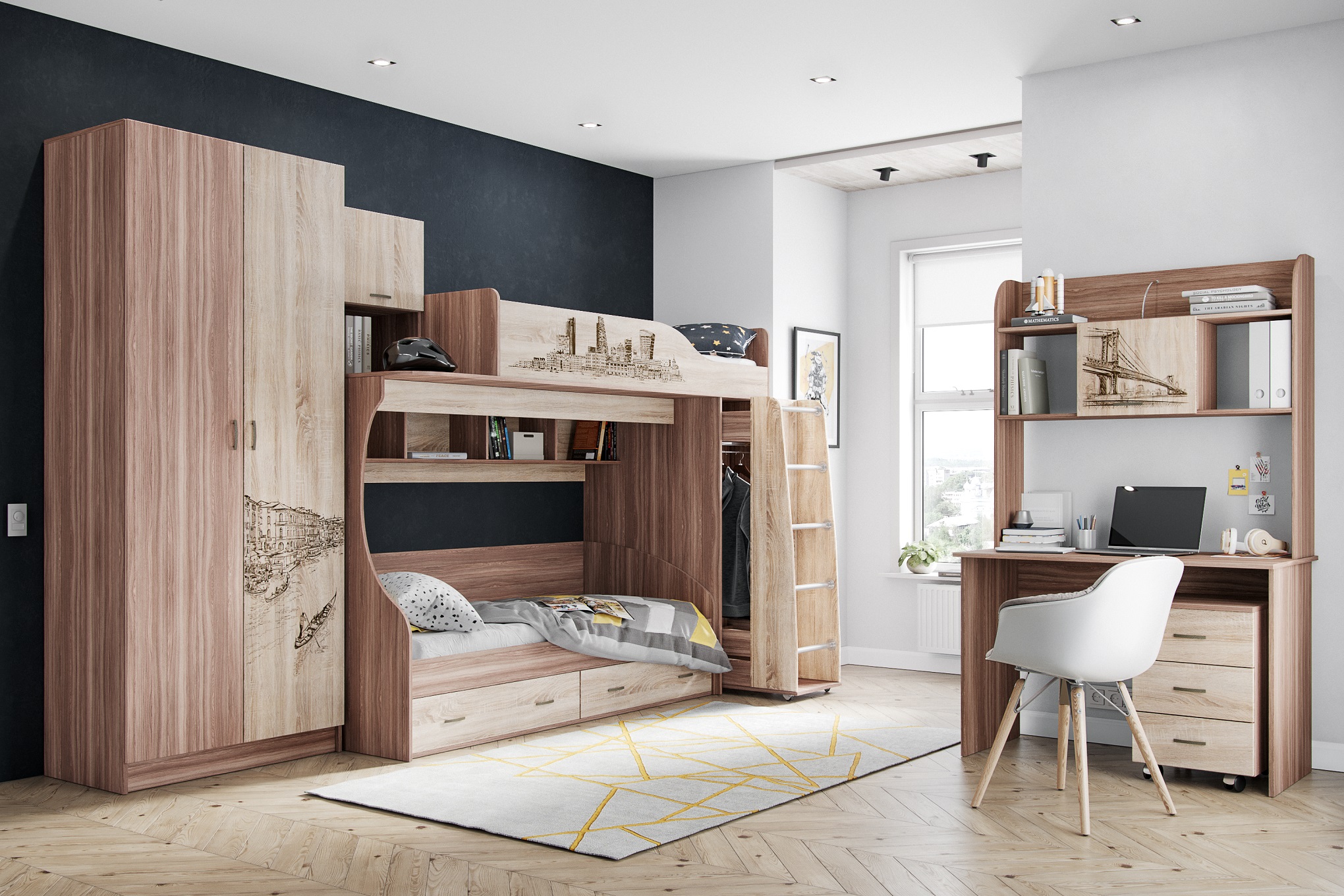 - Широкий выбор модулей: функциональные кровать-чердак и односпальная кровать, прикроватная тумба, разнообразие вместительных шкафов, угловое завершение, комод, навесная секция, письменный стол и стол с надстройкой.