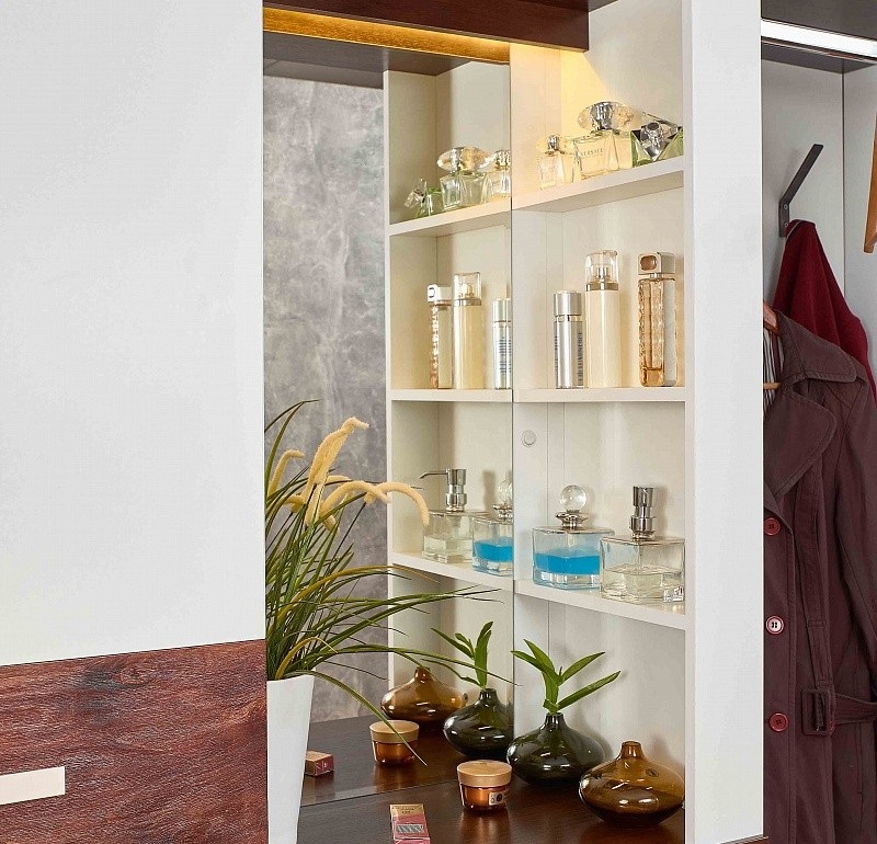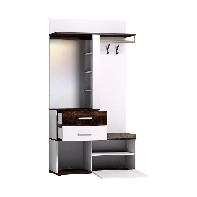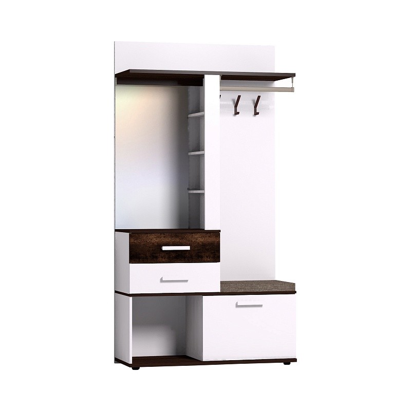 Норвуд 70 Шкаф МЦН — находка для прихожей. В небольшом по габаритам модуле сочетается все необходимое: вешалки и крючки, полки и отделения за глухими фасадами, зеркало с подсветкой и открытый стеллажик. В модуле Норвуд 70 Шкаф МЦН предусмотрено место для хранения коробок и домашней обуви — просторная открытая ниша и ниша с полочкой за откидной дверцей на шарнирах. Мягкая тканевая подушечка входит в комплектацию модуля.