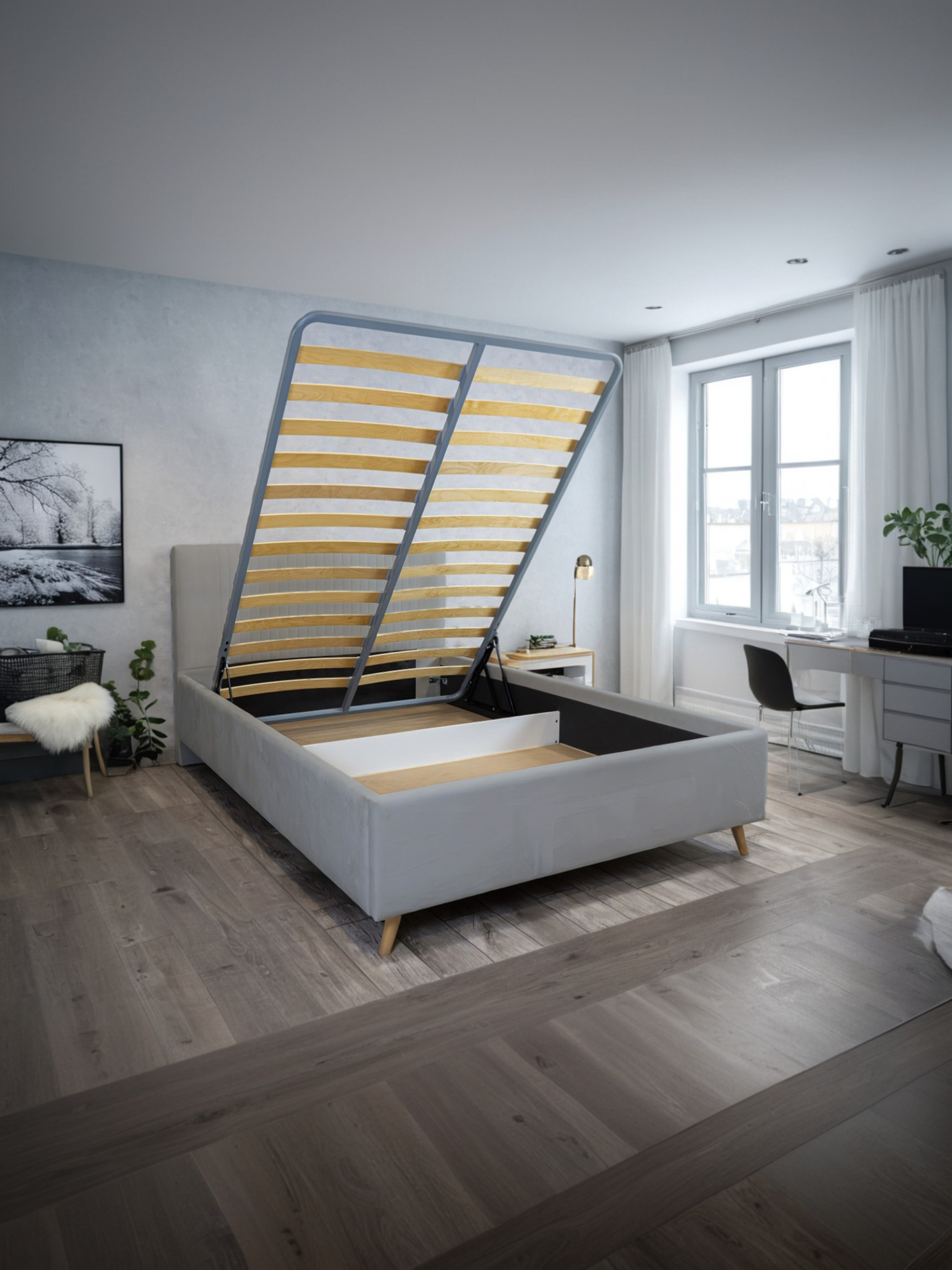 Отличная кровать с подъемным механизмом и вместительным пространством внутри, которое поможет решить вопрос хранения вещей в небольшой спальне. Отделение разделено на две ниши, которые могут легко выполнять роль шкафа для вещей и постельных принадлежностей.