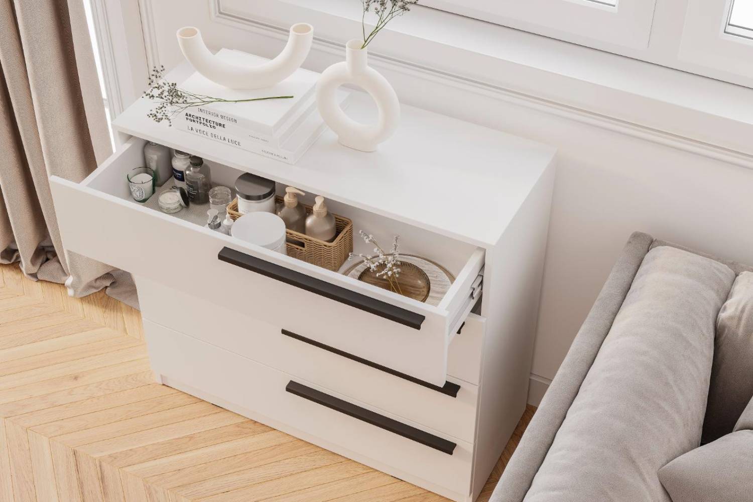 Комод Айрон — это вместительное и универсальное решение для хранения вещей в спальне, домашнем кабинете и гостиной. Он оснащён четырьмя ящиками с эргономичными чёрными ручками.