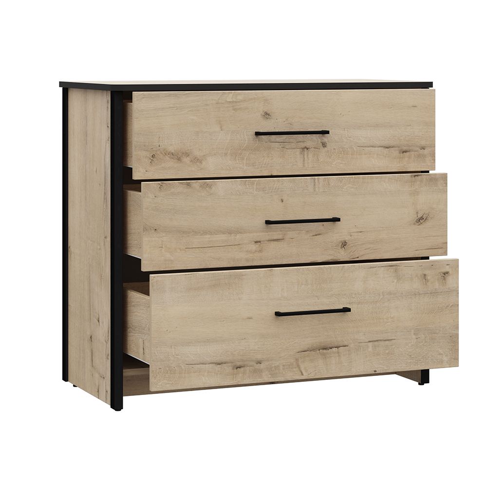 Комод из коллекции Берлин - практичное решение для хранения одежды в сложенном виде, белья и аксессуаров. Модуль выполнен в трендовом декоре "дуб ирландский" с текстурой натурального дерева. Имеет 3 широких выдвижных ящика с тонкими черными ручками. Высококлассный ЛДСП, из которого изготовлен модуль, гарантирует долгий срок его службы.