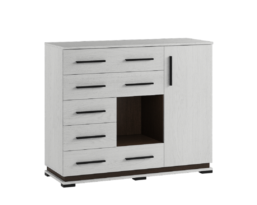 Одним из самых полезных по функционалу модулей в коллекции Модена выступает комод МК-2. Комод имеет столешницу шириной 120 см, на которой Вы с комфортом разместите книги, предметы декора и памятные вещицы. Комплект ящиков пригодится для хранения различных вещей: журналов, небольших коробок, домашней мелочовки. Открытая ниша в центре комода цвета венге пригодится для тех предметов, которые нужно иметь под рукой. Секция за дверцей с полками подарит дополнительное пространство для хранения.