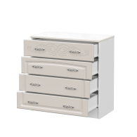 Удобный комод в классическом стиле, который будет гармонично вписываться в интерьер гостиной или спальни. Модуль имеет выкатные ящики на роликовых направляющих. Уточненные ручки выглядят дорого и украшают фрезерованные фасады из МДФ.