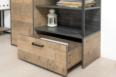 Гостиная "Трувор" выполнена в стиле лофт — идеальное сочетание комфорта, функциональности и эстетики. Металлические стойки с регулируемыми опорами обеспечивают надёжность и долговечность мебели, а лицевая фурнитура с покрытием в тон придаёт мебели аутентичный вид. Петли и направляющие оснащены доводчиками, что обеспечивает плавное закрывание дверей и ящиков. Светодиодная подсветка в витринах с тонированным стеклом эффектно подчёркивает аксессуары, создавая уютную атмосферу.