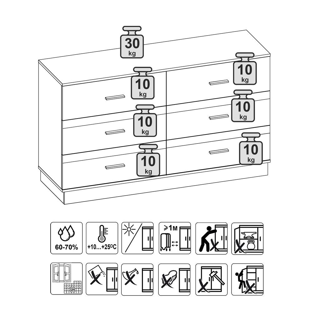 Максимальная нагрузка на верхнюю поверхность комода 30 кг