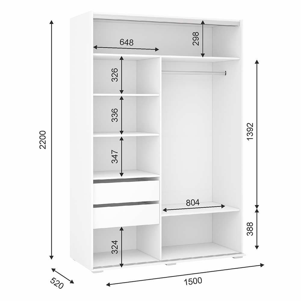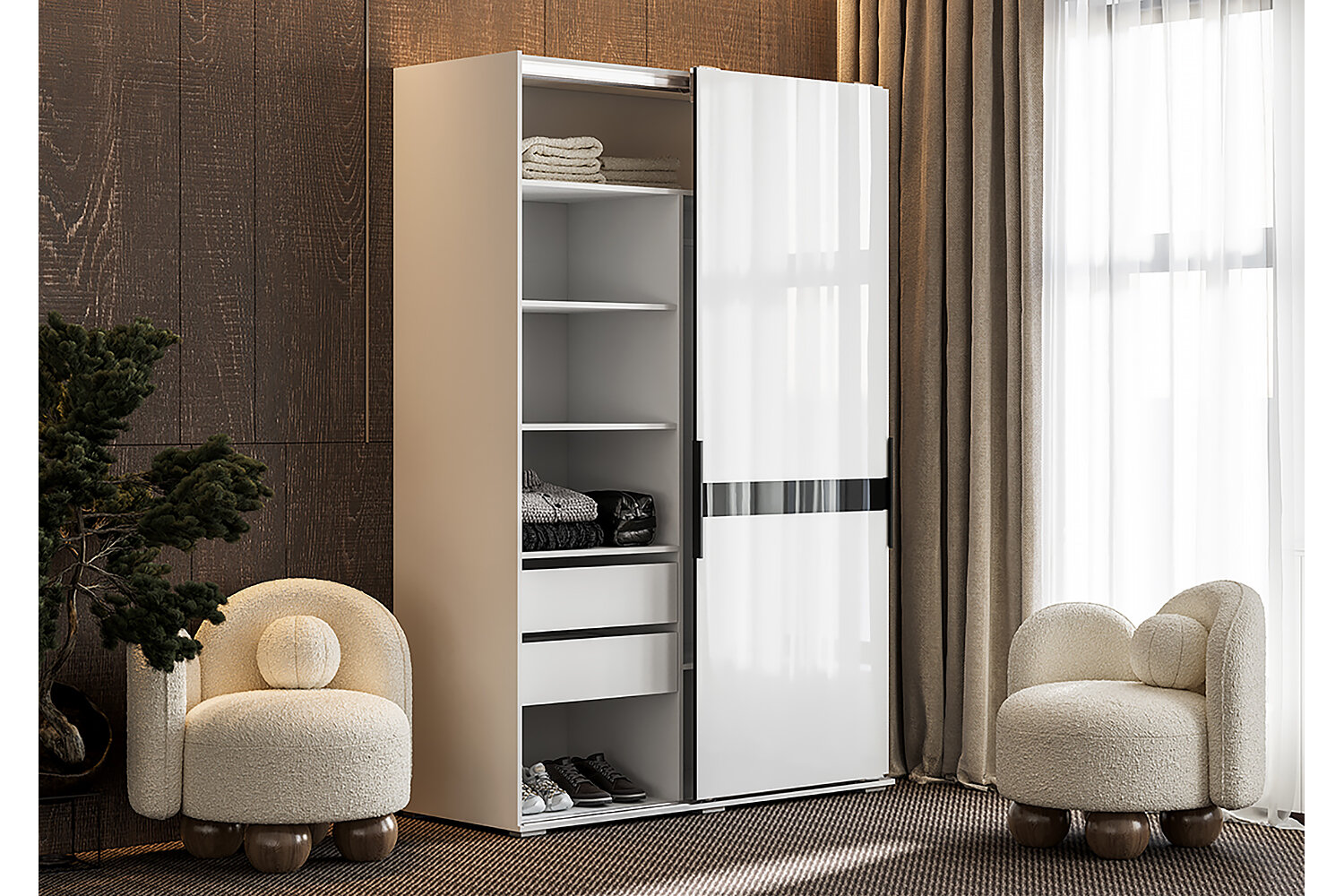 Шкаф-купе Оскар с глянцевыми фасадами, украшенными чёрным стеклом, станет ярким акцентом в любом помещении и будет гармонично сочетаться с остальными элементами интерьера. Шкаф оснащён двумя выдвижными вместительными ящиками, широкой штангой, антресолью и полками.