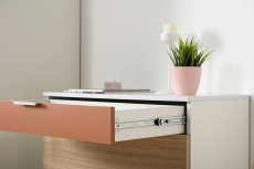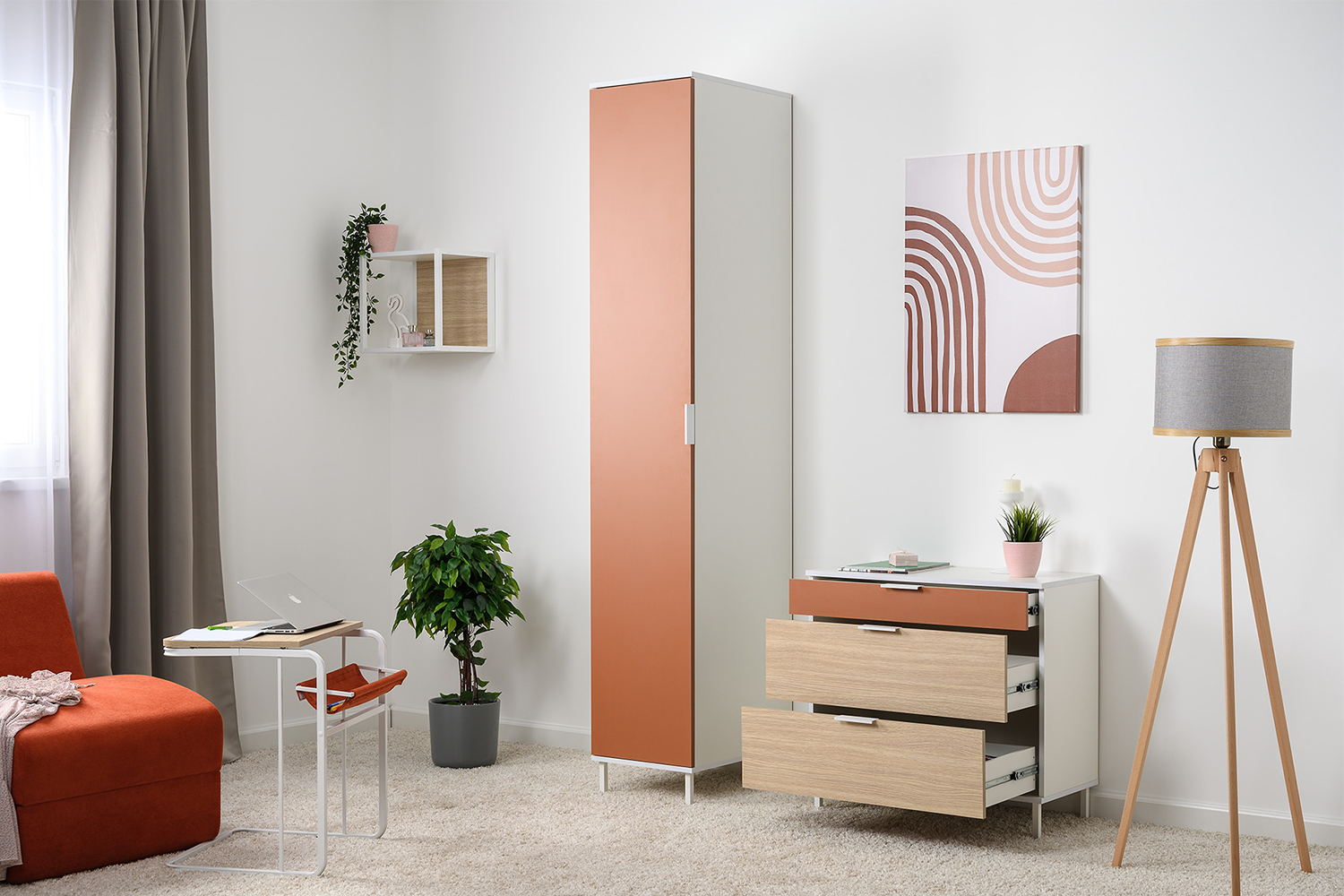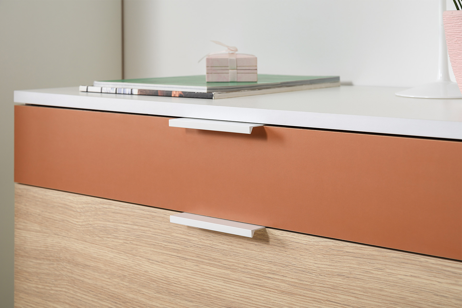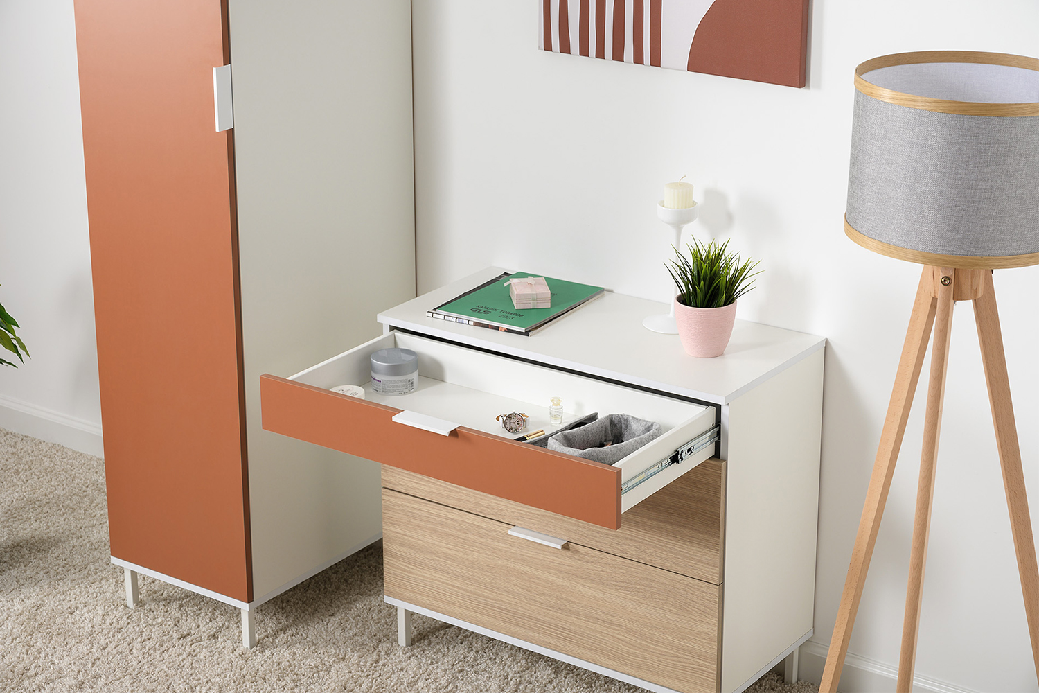 Каждый ящик оснащен надежными шариковыми направляющими, обеспечивающими плавное и бесшумное открытие и закрытие. Просторные ящики позволяют удобно хранить одежду, белье или другие предметы, поддерживая порядок в доме.