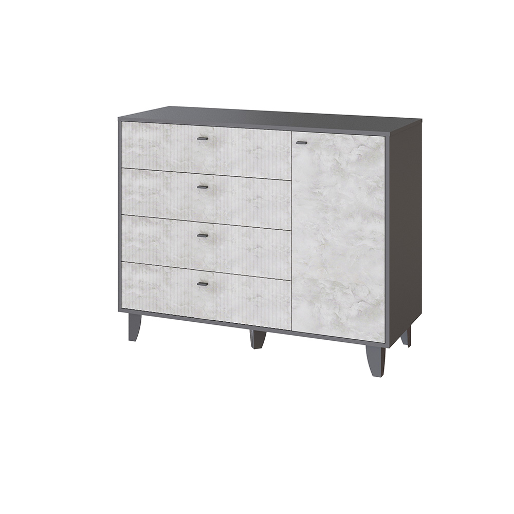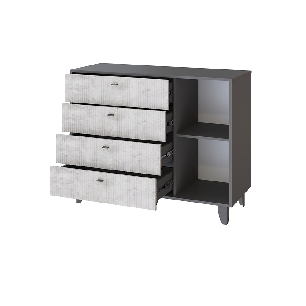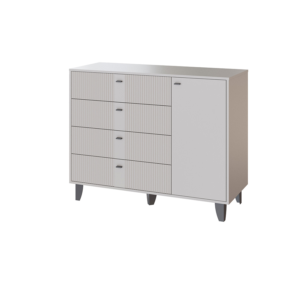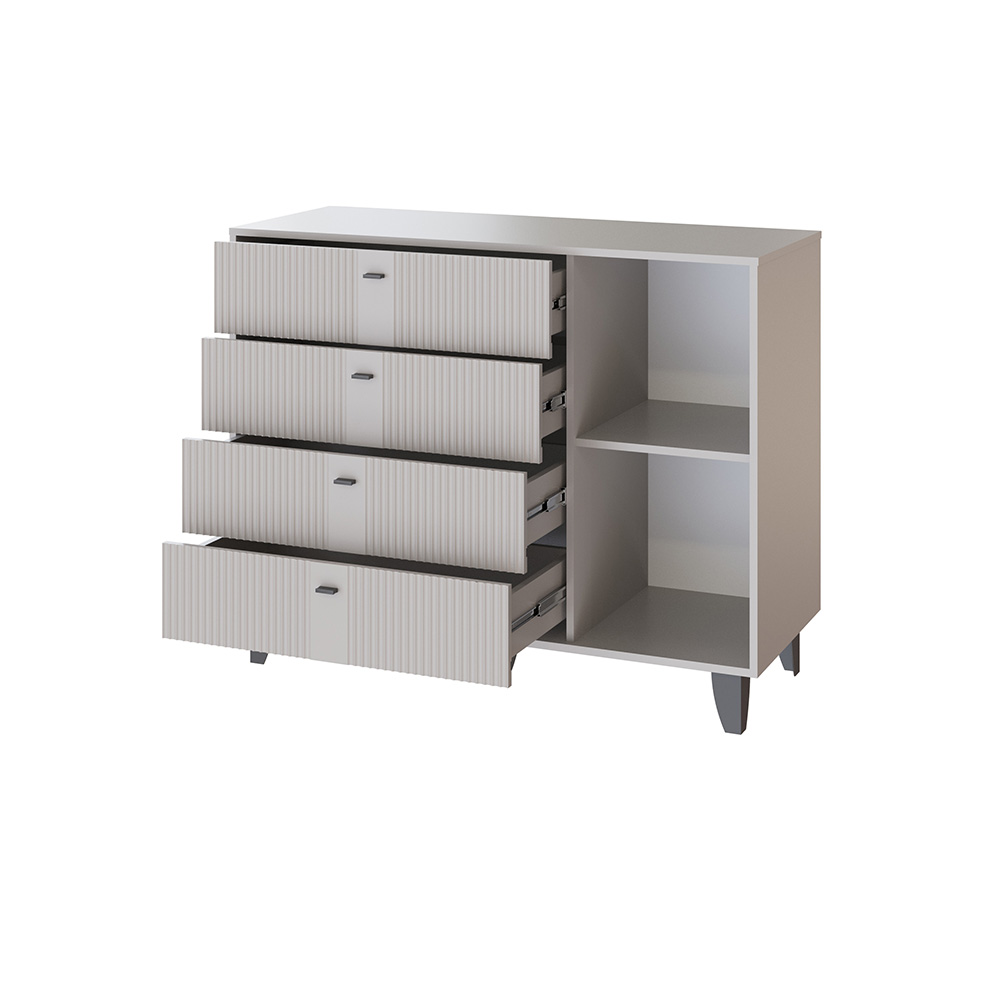 Комод Катрин-13 — это стильный и функциональный элемент интерьера, который станет отличным дополнением к вашей спальне или гостиной. Он выполнен в современном стиле и имеет комбинированную конструкцию, четыре выдвижных ящика и полки за распашными фасадами.
