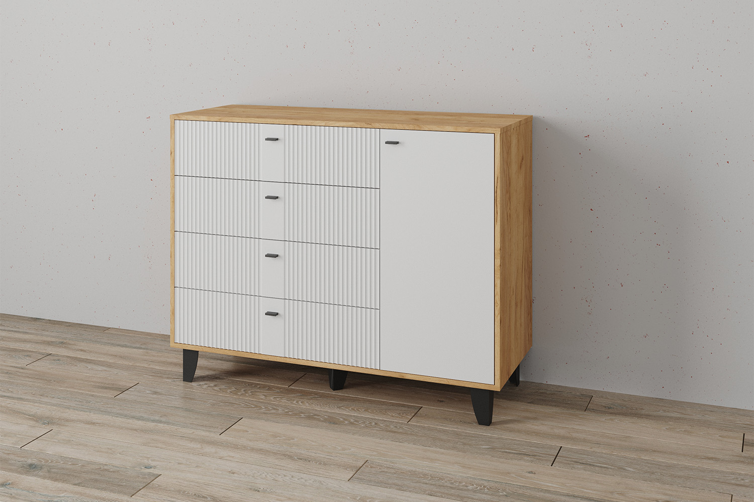 Комод Катрин-13 — это стильный и функциональный элемент интерьера, который станет отличным дополнением к вашей спальне или гостиной. Он выполнен в современном стиле и имеет комбинированную конструкцию, четыре выдвижных ящика и полки за распашными фасадами.
