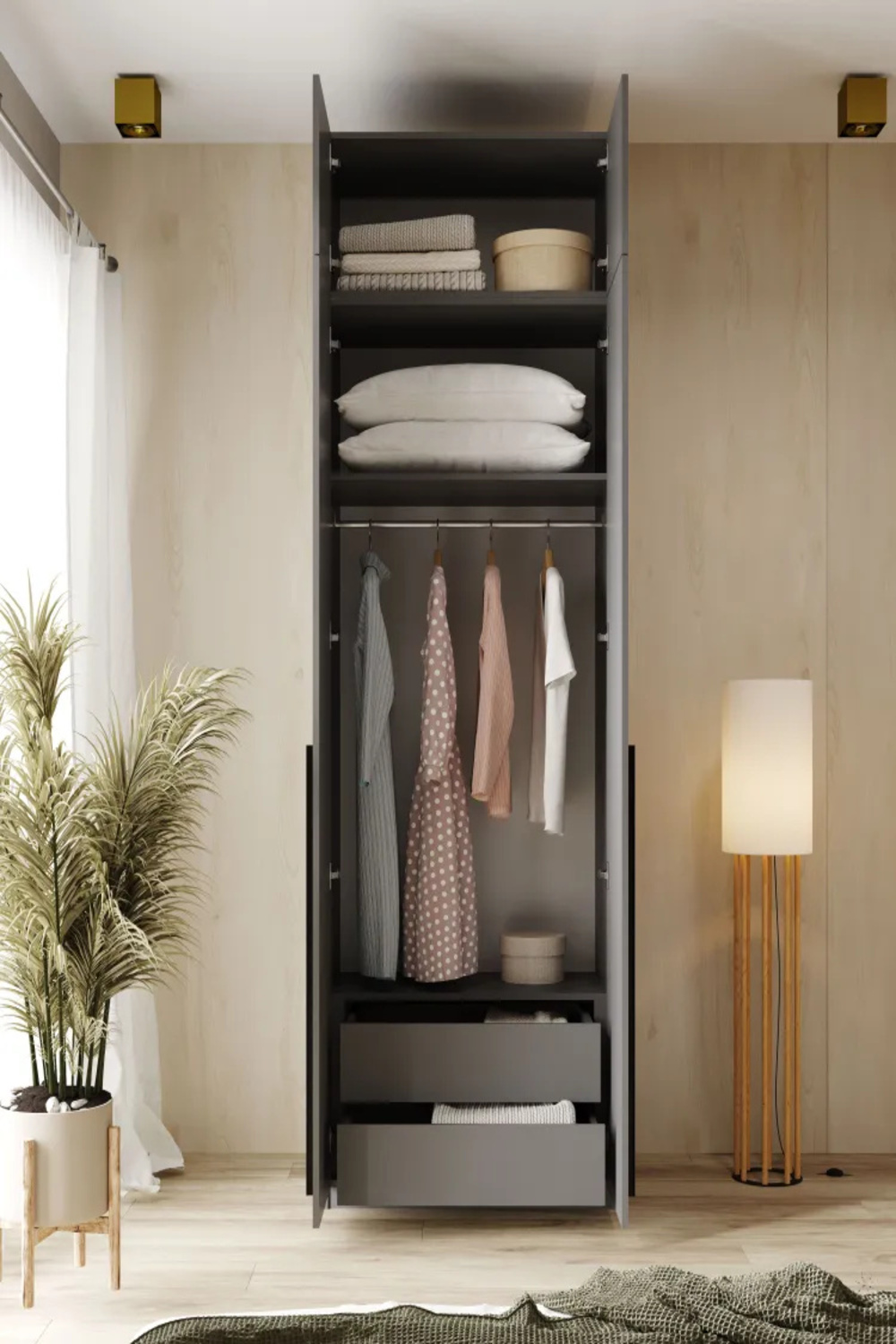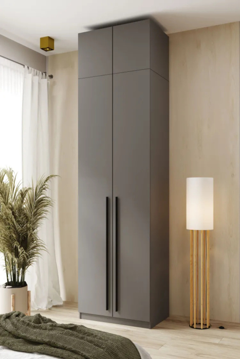 Шкаф обладает оптимальными размерами: 2600х800х500 мм, что делает его достаточно вместительным, но при этом не занимает много пространства. Его двухдверная конструкция обеспечивает лёгкий доступ к содержимому. Внутреннее пространство включает в себя множество полок и удобные ящики, предназначенные для хранения одежды, обуви и аксессуаров. Антресоль предлагает дополнительное место для сезонной одежды или предметов, которые вы не используете каждый день.