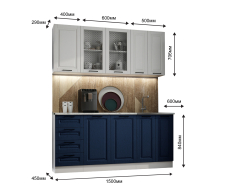 - два нижних шкафа:один на 600мм с распашными фасадами, один на 400 с 4 мя выдвижными ящмками, и стол под мойку (без столешницы) на 500мм - общая ширина 1500. Высота 840мм. Глубина 450мм.
