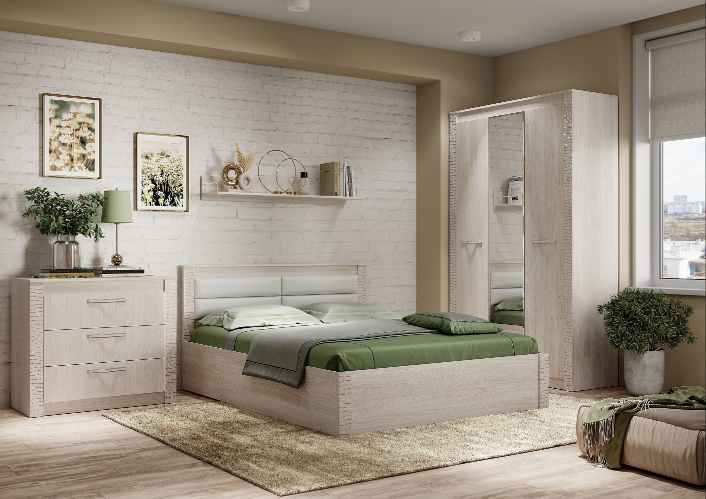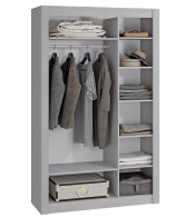 Комплектация шкафа включает несколько полок для хранения вещей в сложенном виде и отделение с хромированной штангой для одежды на вешалках. Для изготовления используется качественная ЛДСП цвета белого ясеня. Центральная створка — полностью зеркальная, две другие дополнены изящными ручками.