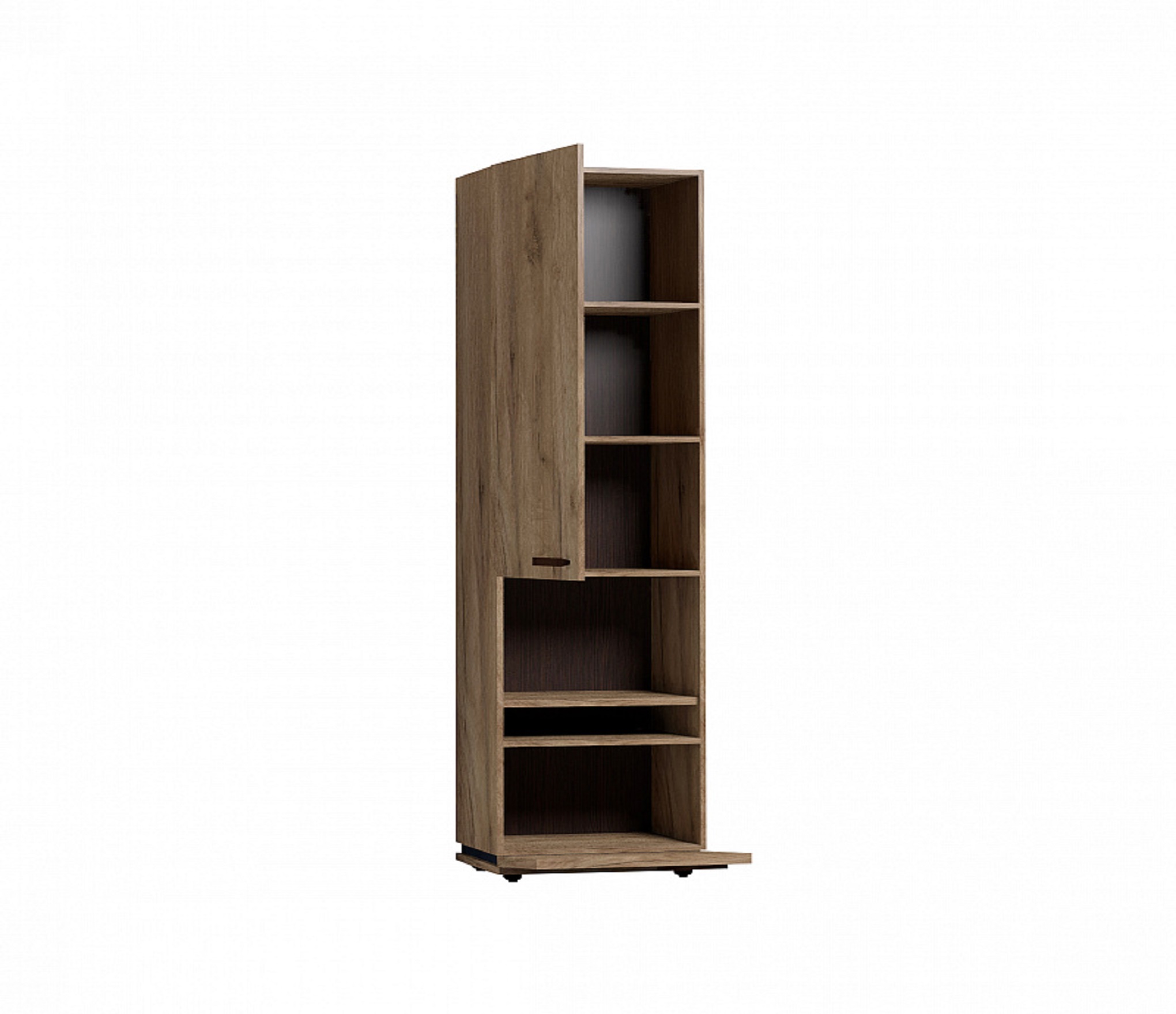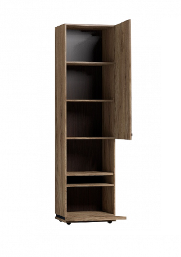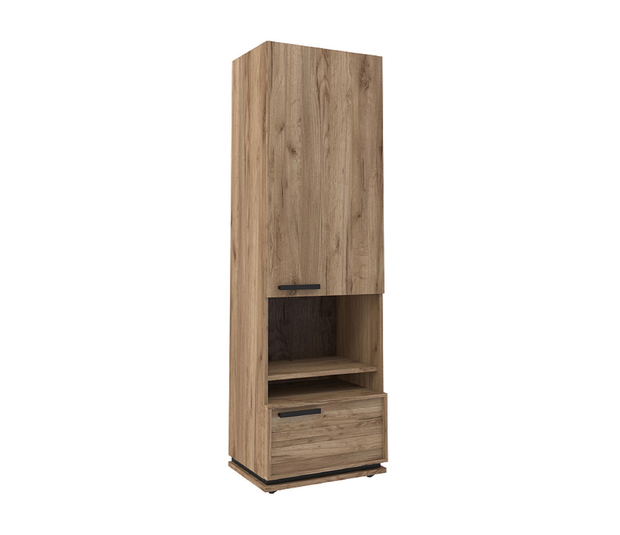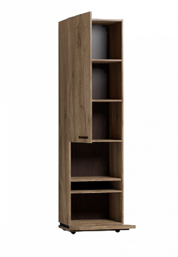 Благородный древесный оттенок шкафа, контрастирующий с черными ручками из массива дерева, подойдет к большинству цветовых решений – мебель будет легко комбинировать с другими предметами. Высокий шкаф МЦН удобен своей функциональностью и эргономичностью конструкции. На открытой полке разместите фотографии или элементы декора, а за глухими фасадами спрячьте документы и ценные вещи от посторонних глаз. Регулируемые опоры шкафа позволят компенсировать незначительные неровности пола.