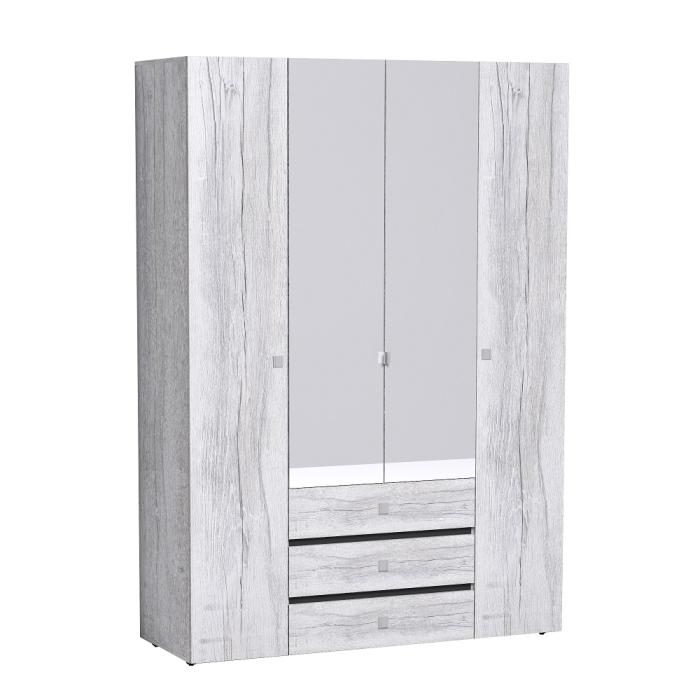 Neo 555 – уникальный по конструктиву шкаф. Зона хранения в нем разделена на 2 симметричные половины: за глухими фасадами расположены регулируемые по высоте полки, а за зеркальными скрывается стационарная штанга, которая выдерживает нагрузку в 40 кг. 3 выдвижных ящика имеют размеры (ШхГхВ) 75х40х14 см каждый и оснащены направляющими плавного выдвижения.
