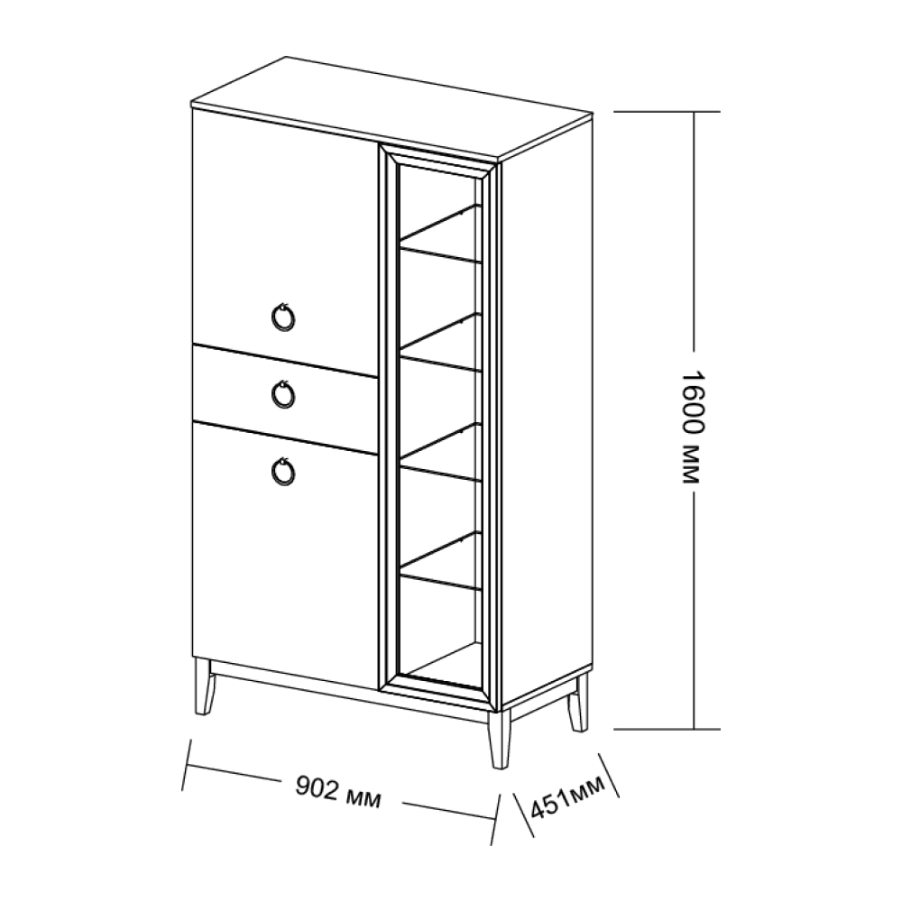 Шкаф-витрина с дверцей и ящиком Шарлиз - лаконичный предмет мебели, который создан, чтобы украсить современную гостиную. Шкаф разделен на две зоны. Ниша со стеклом подойдет для хранения книг, посуды и предметов декора. Глухая часть оснащена закрытыми полками и ящиком, что позволит разместить различные по размеру и назначению вещи.