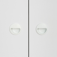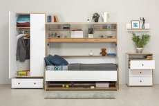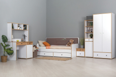 Корпус и фасады шкафа изготовлены из экологически чистой ламинированной ДСП толщиной 16 мм, а торцы окромлены ПВХ-плёнкой толщиной 0,4 мм. Лицевая фурнитура выполнена из чёрного пластика, а при отсутствии лицевой фурнитуры фасады открываются за вырез по центру. Распашные двери модулей молодёжной Вуди установлены на четырёхшарнирных петлях без доводчиков. Выдвижной ящик на шариковых направляющих обеспечивает тихую и долговечную работу.