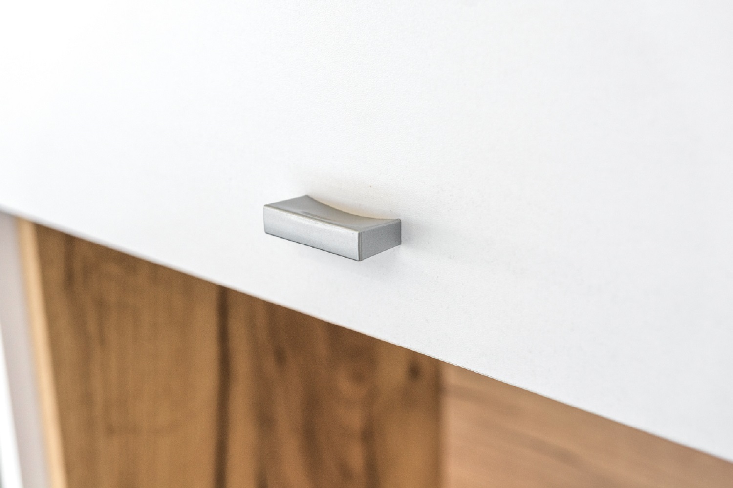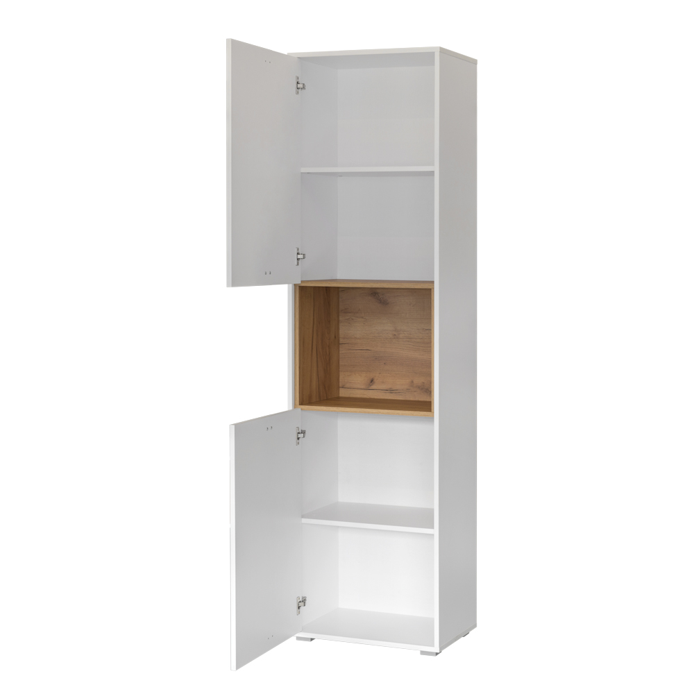 Однодверный шкаф Бэль с фасадами из глянцевого ЛДСП в цвете «белый премиум» и корпусом в цвете «дуб крафт золотой» — это стильный и функциональный предмет мебели. Он оснащён открытыми полками, что обеспечивает удобное хранение различных предметов. Ручки шкафа выполнены из ABS-пластика.