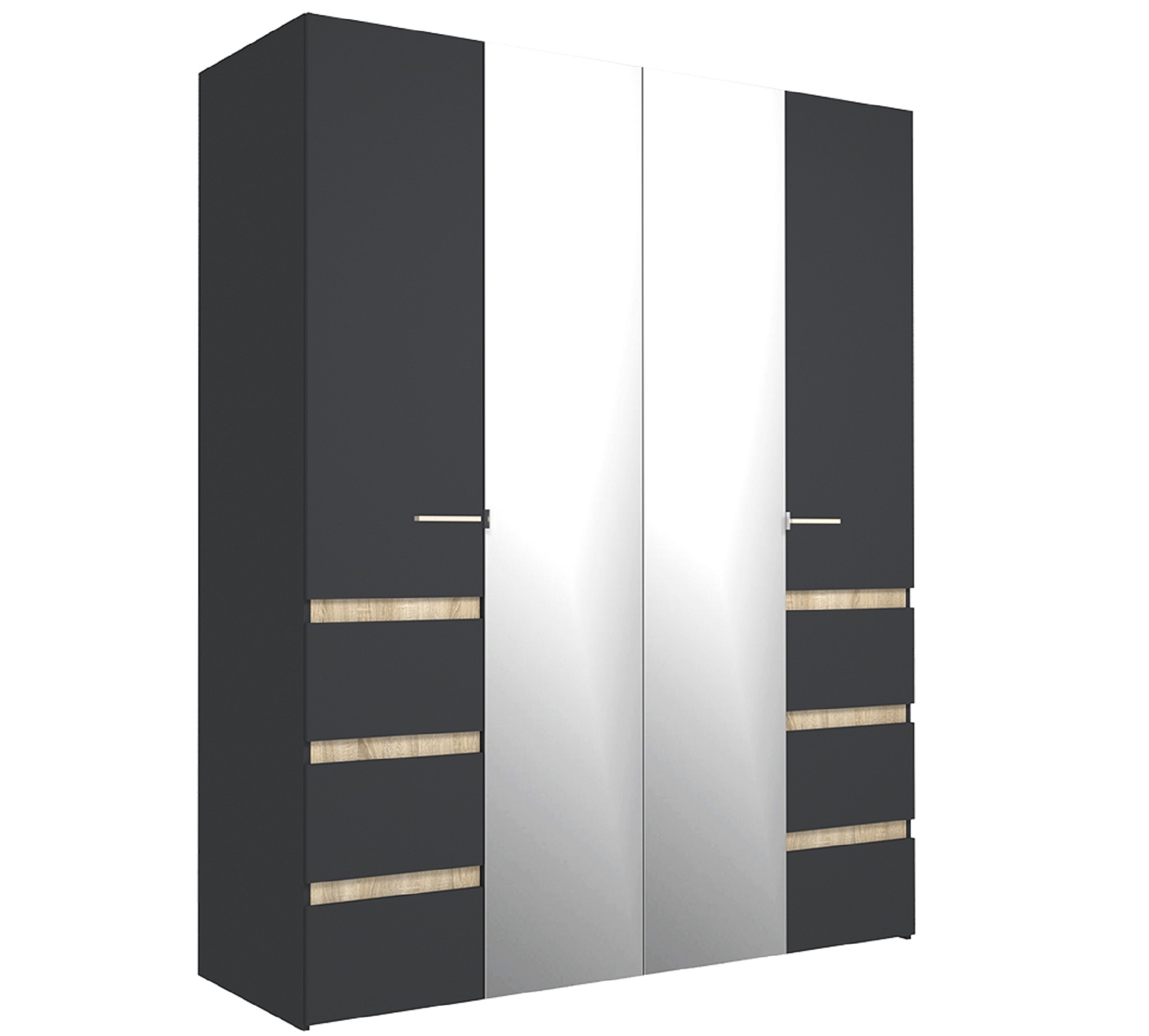 Шкаф распашной четырёхдневный с декоративными вставками дуб сонома. Особенно эффектно смотрится двери с зеркалами в сочетании с цветом антрацит. За фасадами вы найдете отсек с хромированной штангой и антресолью и секцию с полками.