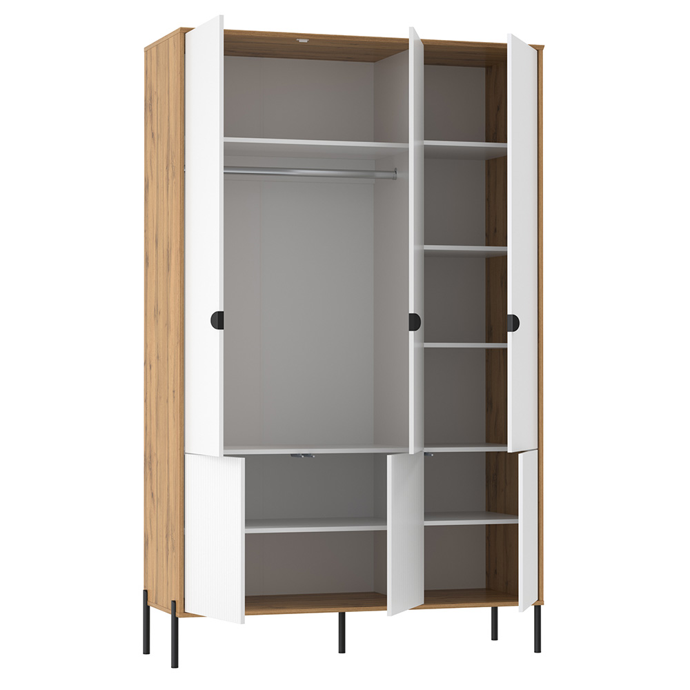 Трехстворчатый шкаф Кензо идеально подойдет для небольшой квартиры. Он не только функциональный, но и вместительный. Внутри шкафа есть все необходимое для размещения вашего гардероба: полки для белья, длинная штанга, над секцией со штангой расположена полкаантресоль.