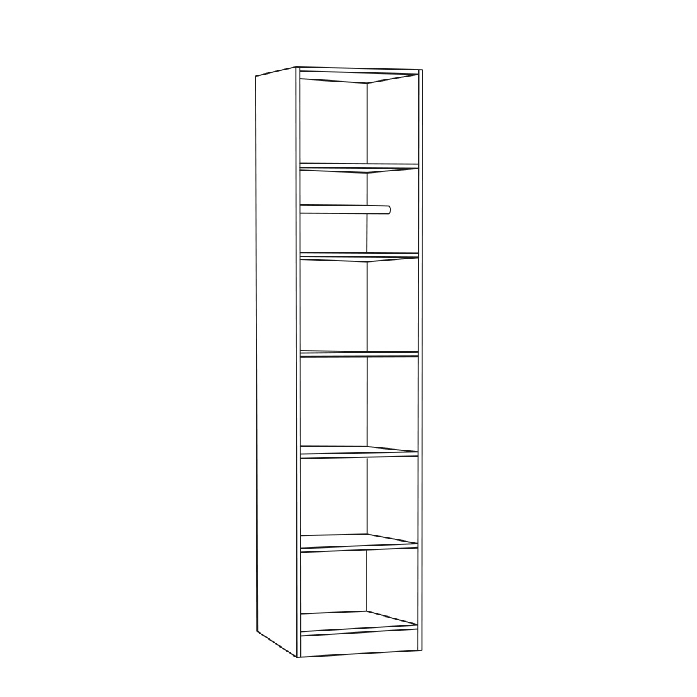 Внутреннее наполнение включает штангу для вешалок, а также полки для хранения одежды, обуви и других вещей.