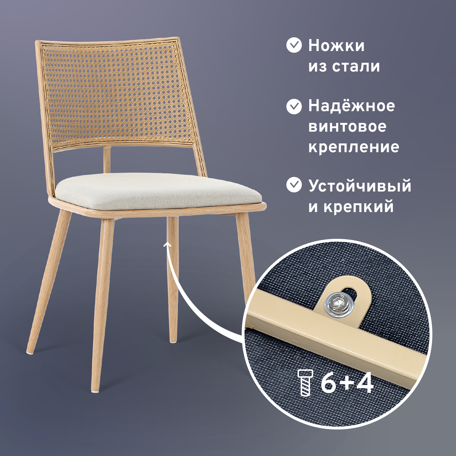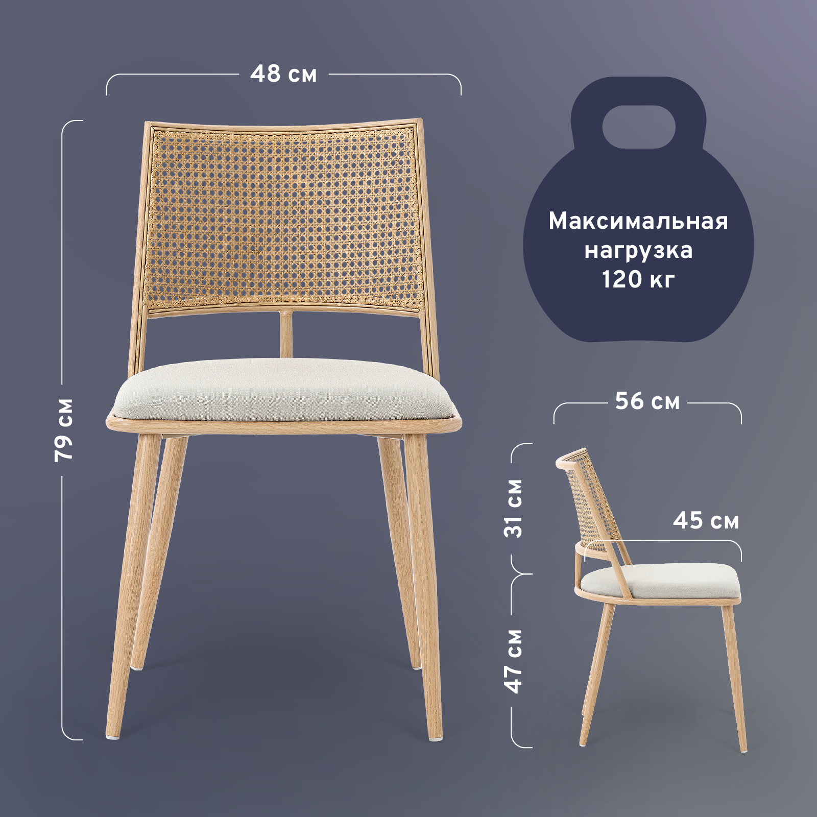 Спинка стула выполнена из искусственного ротанга, что придает ему современный и стильный вид. Максимальная нагрузка на стул составляет 120 кг, что делает его надежным и устойчивым.