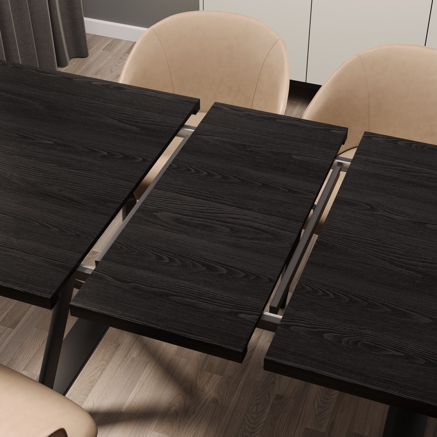 Высота стола достигает 75 см, что обеспечивает комфорт при использовании. Столешница толщиной 3,6 см выполнена из качественного МДФ, а насыщенный чёрный цвет с текстурой дерева добавляет элегантности и тепла, создавая уютную атмосферу для семейных встреч и подчеркивая ее современный вид. Подстолье, выполненное из матового металла, обеспечивает надежную опору и устойчивость конструкции. Ножки стола, изящно оформленные в форме песочных часов, добавляют нотку оригинальности и утонченности.