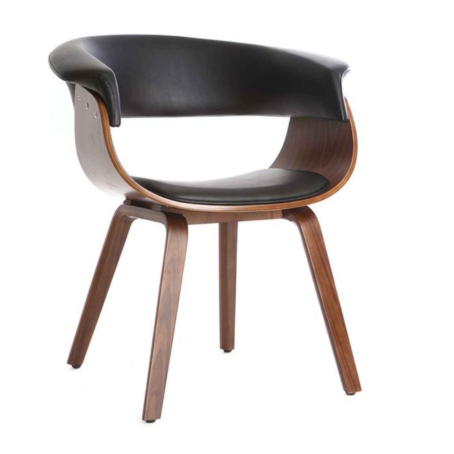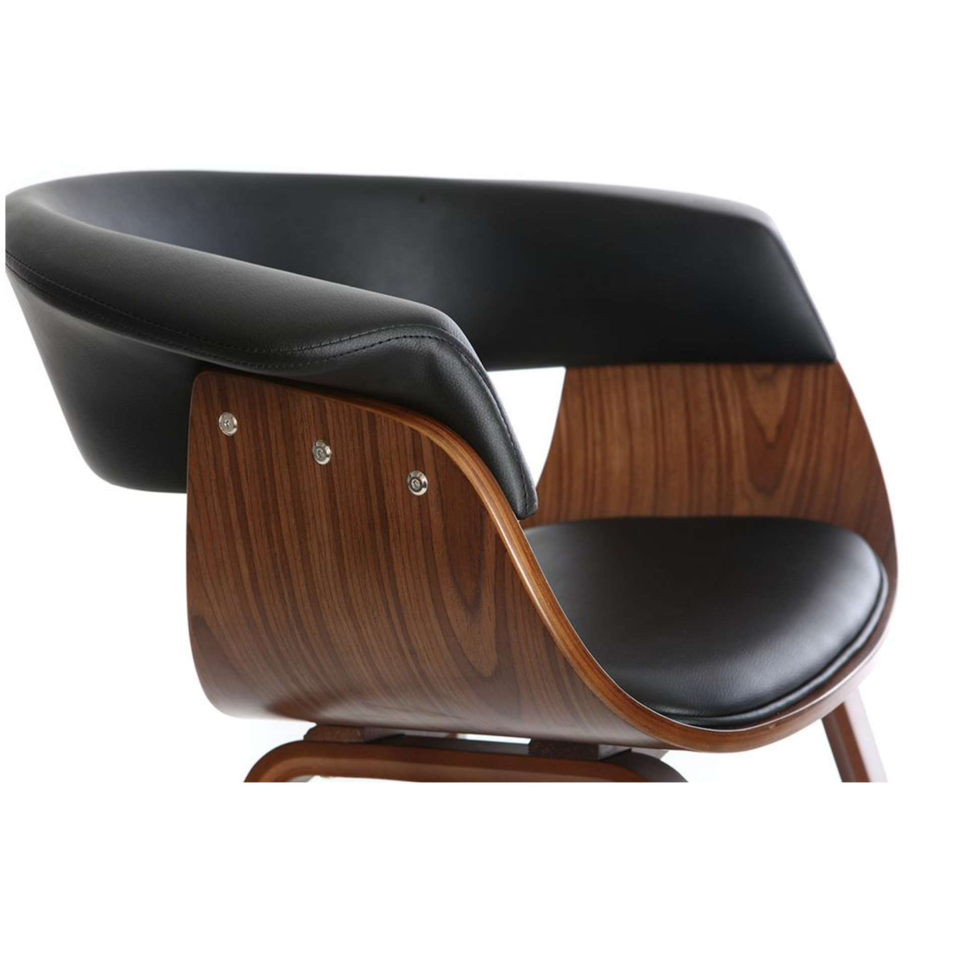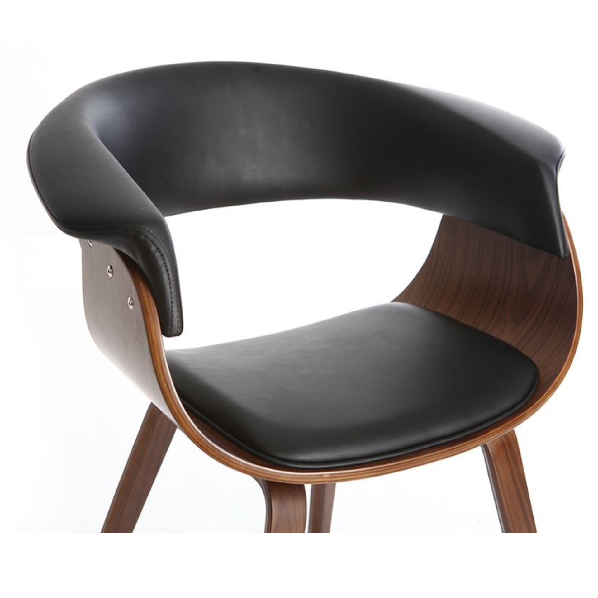 Стул выполнен в минималистичном стиле с акцентом на изысканные детали. Основание и ножки изготовлены из тонированной гнутой фанеры, что придает модели легкость и изящество. Коричневый цвет основания гармонично сочетается с черной обивкой из искусственной кожи, создавая контрастный и стильный образ.
