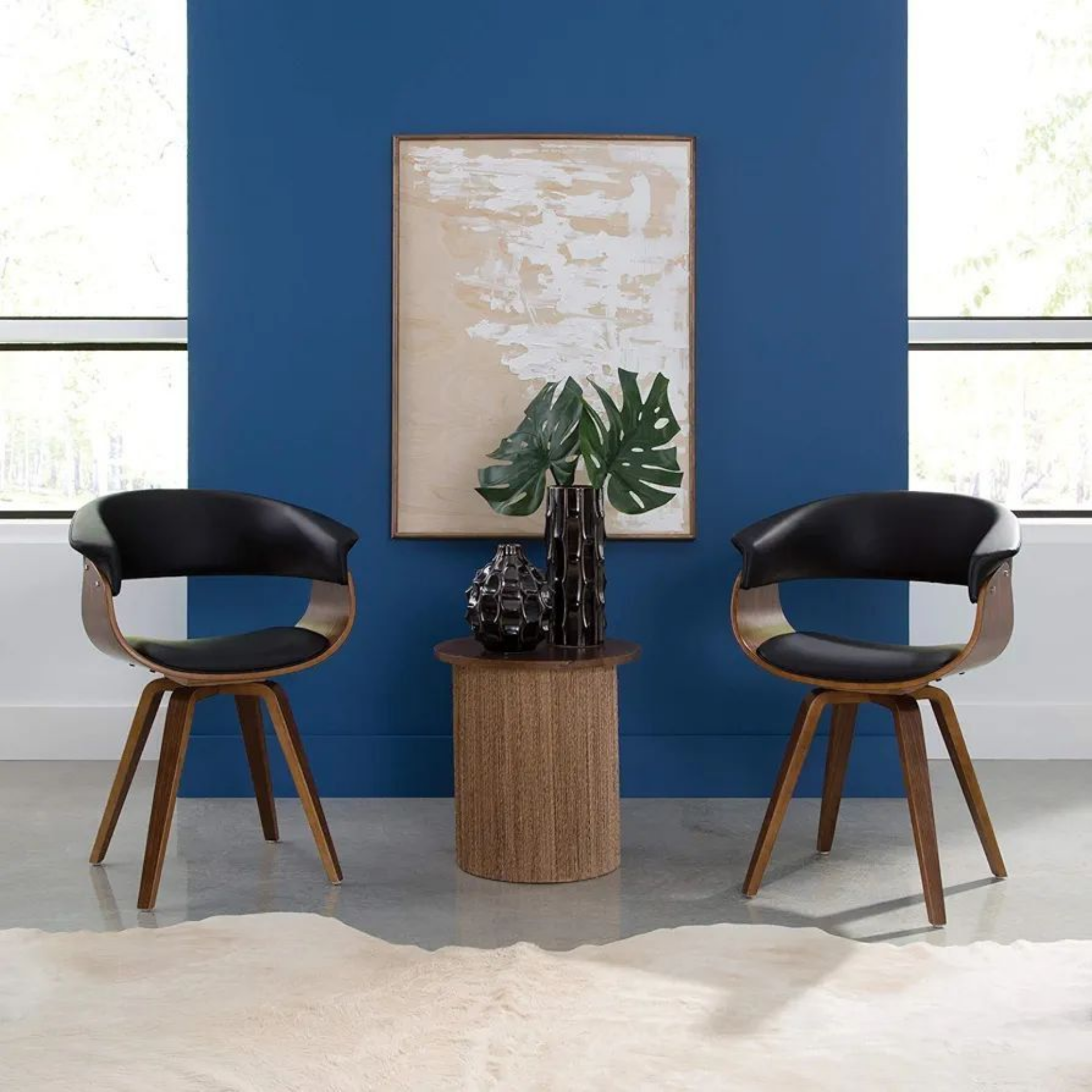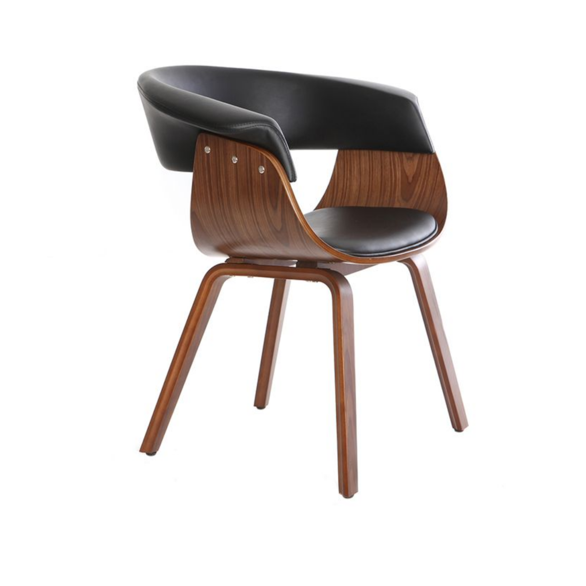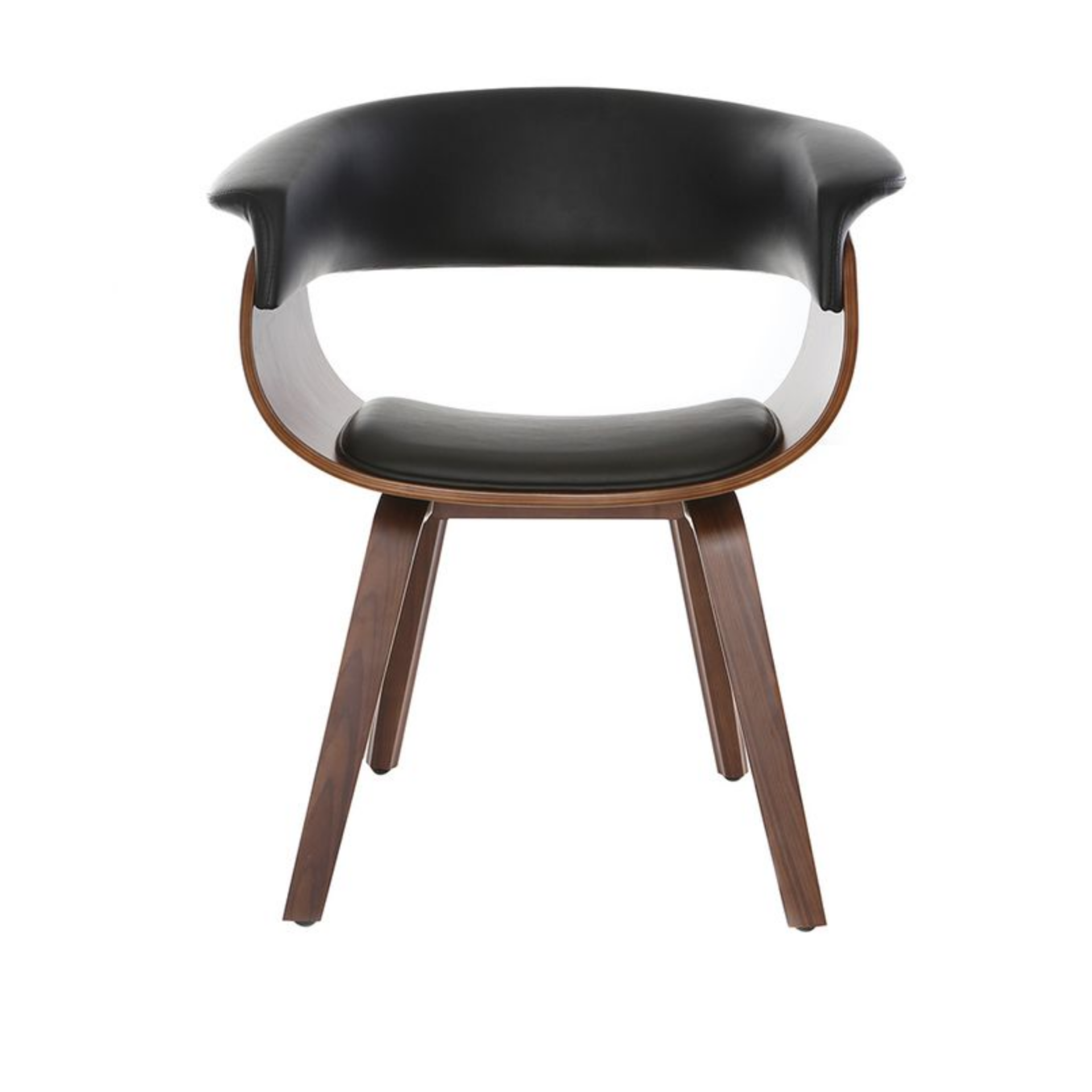 Стул выполнен в минималистичном стиле с акцентом на изысканные детали. Основание и ножки изготовлены из тонированной гнутой фанеры, что придает модели легкость и изящество. Коричневый цвет основания гармонично сочетается с черной обивкой из искусственной кожи, создавая контрастный и стильный образ.