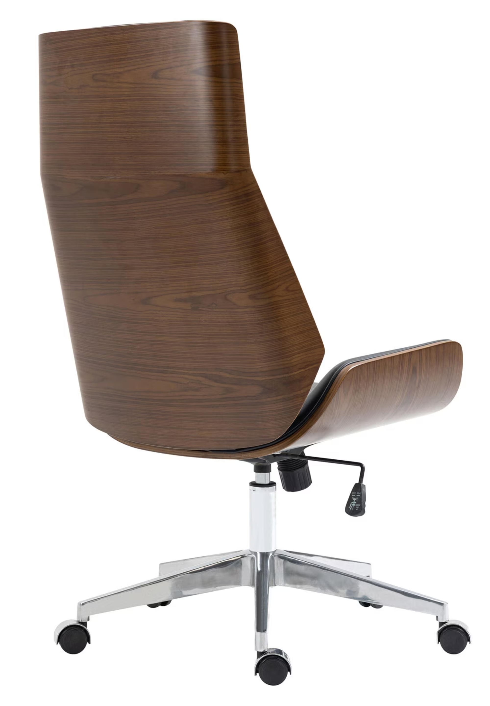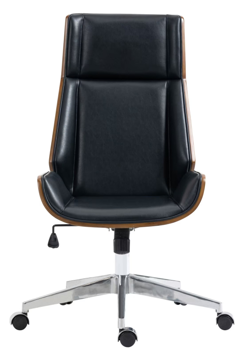 Корпус кресла выполнен из гнутой тонированной фанеры в насыщенном коричневом цвете, что придает ему нотку тепла и элегантности. Черная искусственная кожа обивки добавляет современности и изысканности, легко вписываясь в любой офисный интерьер.