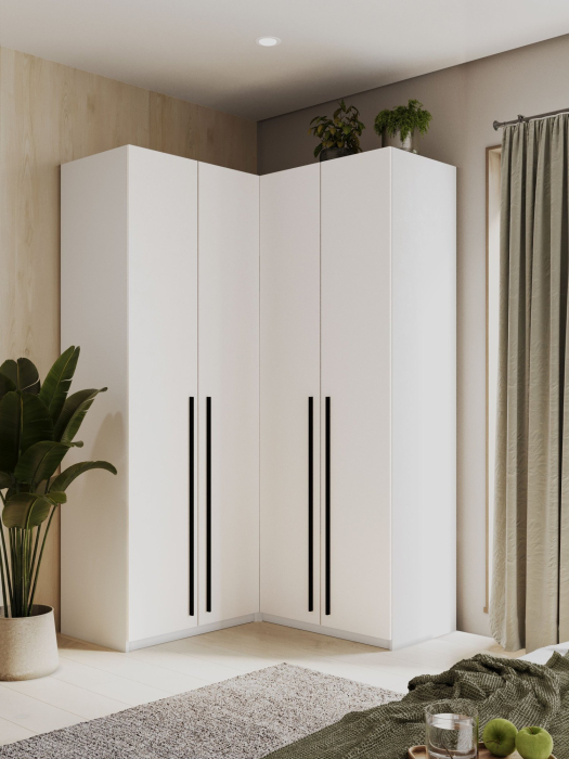 Белый цвет добавляет светлоты и легкости в интерьер, создавая атмосферу уюта и комфорта. Угловой дизайн шкафа позволяет оптимально использовать пространство, особенно в небольших помещениях, и делать его более функциональным. Вы сможете легко разместить одежду, обувь и различные аксессуары, обеспечивая легкий доступ ко всему необходимому.