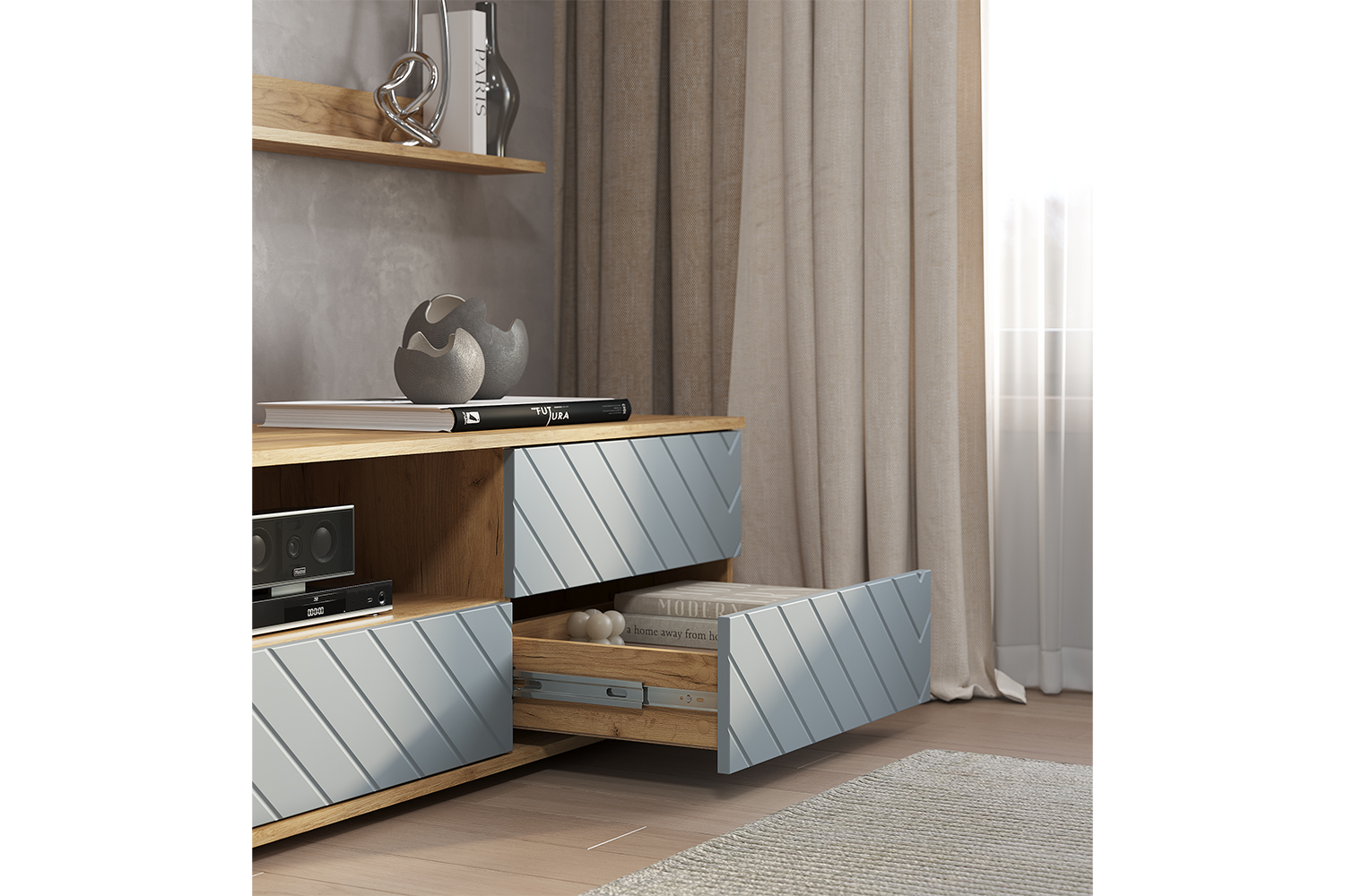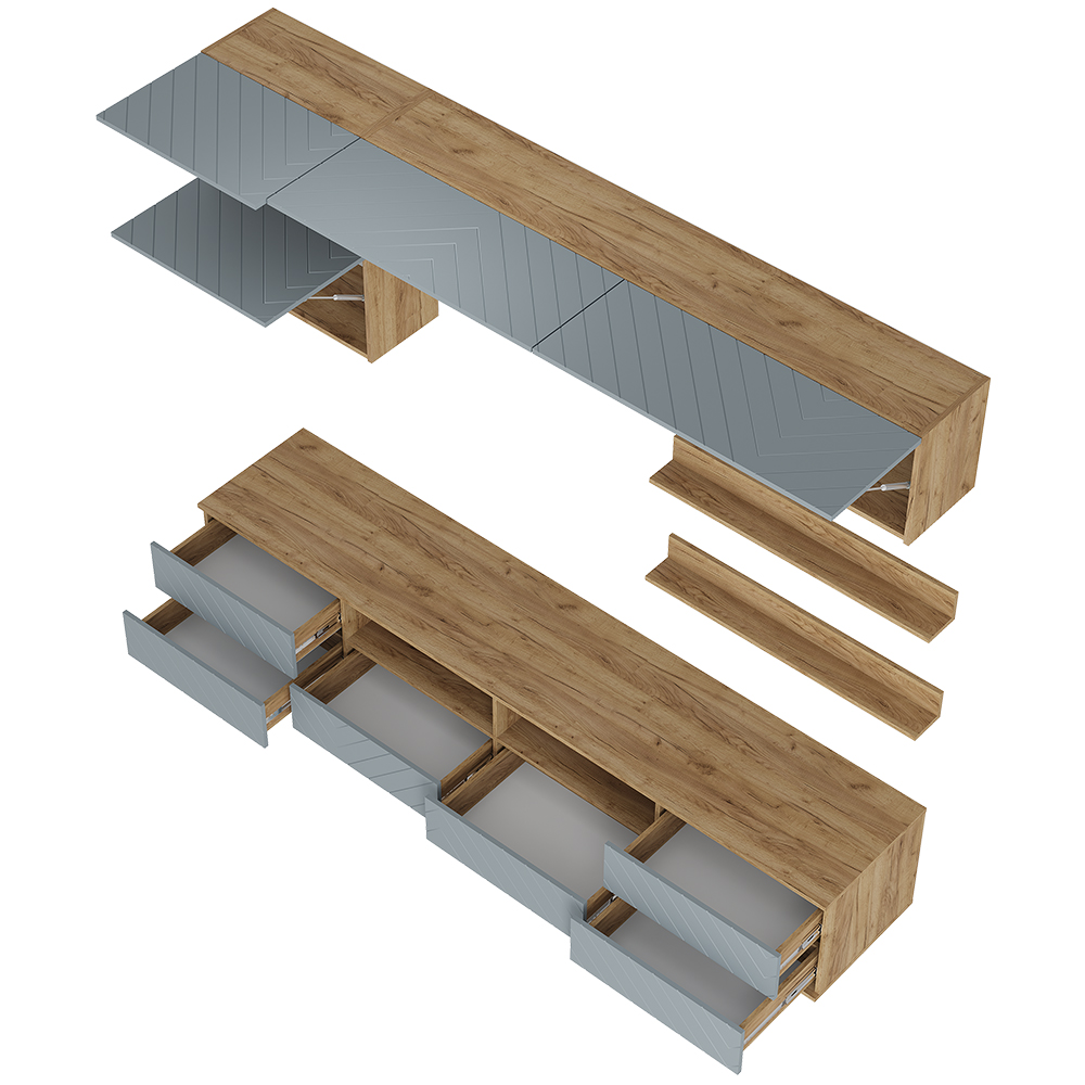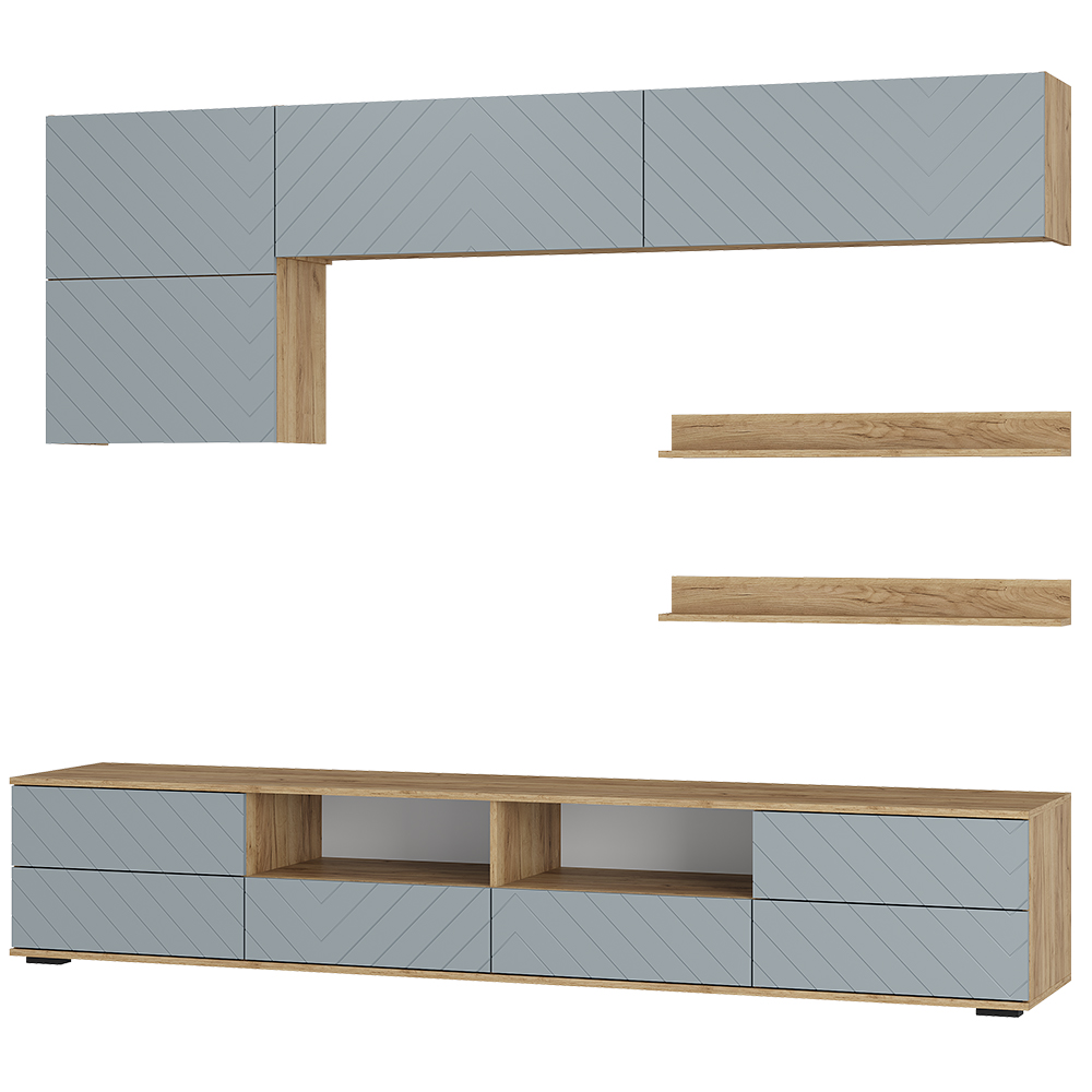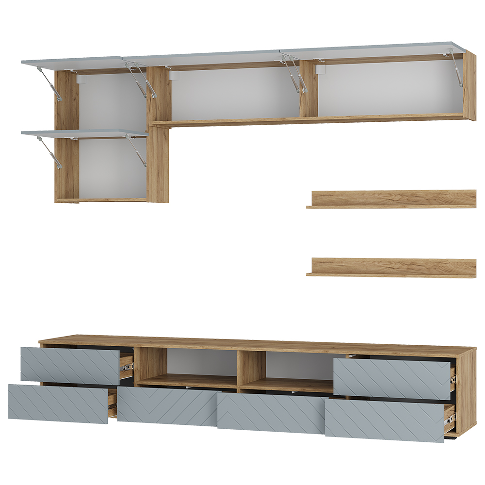 Особенности: - Материал корпуса: ЛДСП, цвет Дуб крафт - Материал фасада: МДФ, цвет Шарли - Направляющие ящиков: Шариковые полного выдвижения 350 мм - Петли створок: накладная без доводчика - Толщина кромки: 0.45 мм - Место под ТВ: 1800?750?450 - Варианты открывания модулей: толкатель с магнитом; за край удлиненного фасада - Опоры: прямоугольные, черные 20 мм - Крепление к стене: Р-образные, L-образный - Максимальная нагрузка на полку: 3 кг - Максимальная нагрузка на выдвижной ящик: 5 кг - Максимальная нагрузка на крышку: 30 кг