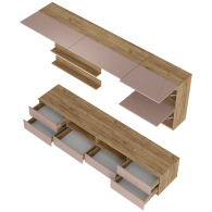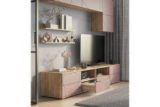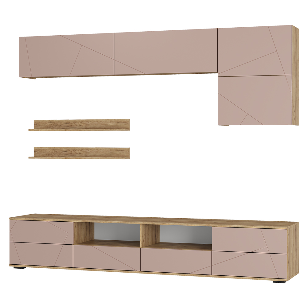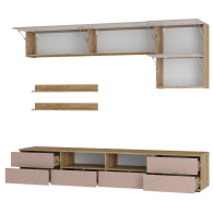 Особенности: - Материал корпуса: ЛДСП, цвет Дуб крафт - Материал фасада: МДФ, цвет Шарли - Направляющие ящиков: Шариковые полного выдвижения 350 мм - Петли створок: накладная без доводчика - Толщина кромки: 0.45 мм - Место под ТВ: 1800?750?450 - Варианты открывания модулей: толкатель с магнитом; за край удлиненного фасада - Опоры: прямоугольные, черные 20 мм - Крепление к стене: Р-образные, L-образный - Максимальная нагрузка на полку: 3 кг - Максимальная нагрузка на выдвижной ящик: 5 кг - Максимальная нагрузка на крышку: 30 кг
