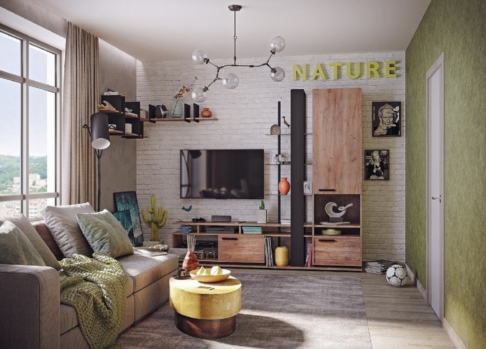 Минимализм в гостиной: NATURE 5 Тумба МЦН и композиция из Стеллажей и Навесных полок