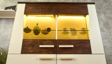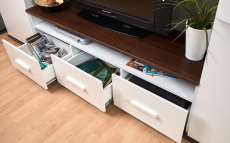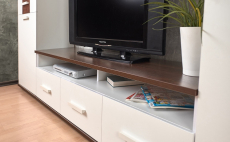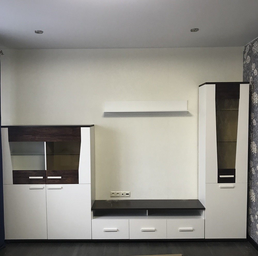 В качестве декора лучше всего использовать предметы из натуральных материалов: деревянные рамки с фотографиями, фигурки, металлические подсвечники. Основной декор гостиной НОРВУД — Белый. Именно он отвечает за визуальное расширение пространства и освещения. Контрастные горизонтальные поверхности толщиной 22 мм в декоре Орех Шоколадный разбавляют белые фасады модулей.