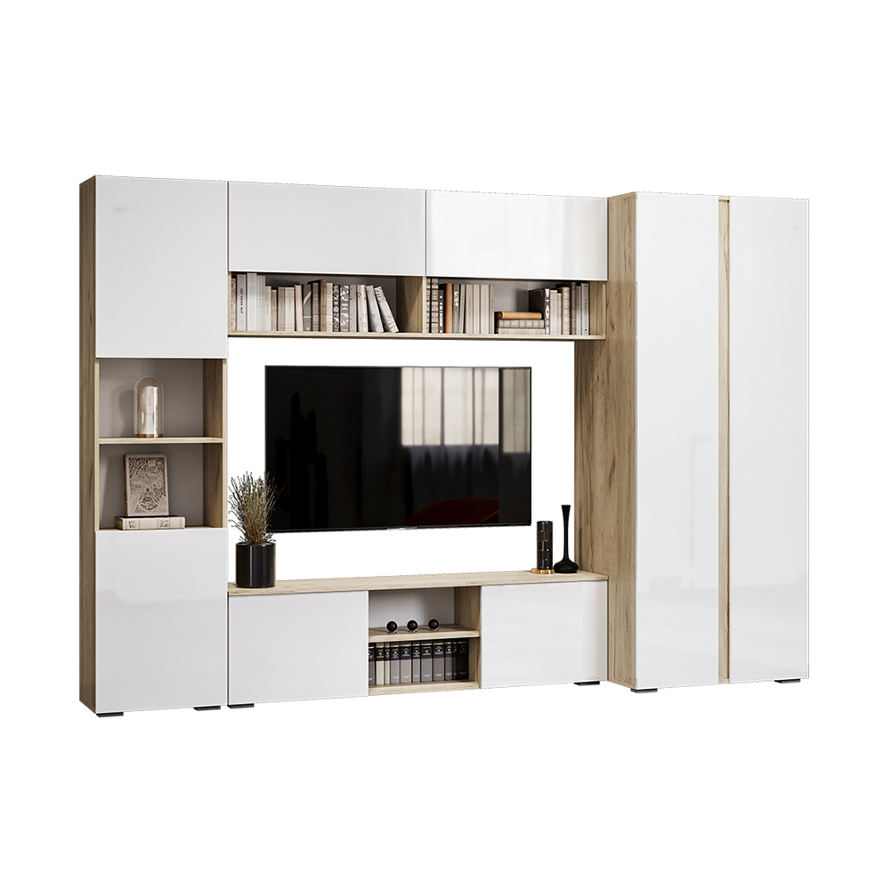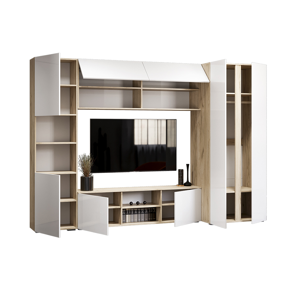 Модульная коллекция Вирола украсит вашу гостиную. Белые глянцевые фасады отлично сочетаются с корпусом в древесных оттенках. Лицевая фурнитура отсутствует, фасады открываются с помощью захвата рукой