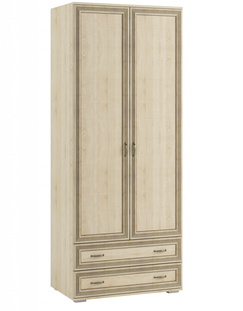 Двустворчатый шкаф для одежды и белья Ливорно. Оснащен штангой и двумя выдвижными ящиками в нижней части.Материал фасада:Рамочный профиль из МДФ, 3D-вставка из МДФ.Материал корпуса:ЛДСП.Установлены петли с доводчиками для бесшумного закрывания и шариковые направляющие полного выдвижения.Фурнитура:«Старая бронза» 96 мм