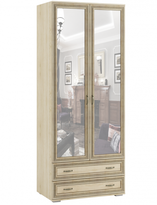 Двустворчатый шкаф для одежды и белья Ливорно. Оснащен штангой и двумя выдвижными ящиками в нижней части. Зеркальные двери способны создать комфортную обстановку для организации гардеробной части. Материал фасада:Рамочный профиль из МДФ, 3D-вставка из МДФ.Материал корпуса:ЛДСП.Установлены петли с доводчиками для бесшумного закрывания и шариковые направляющие полного выдвижения.Фурнитура:«Старая бронза» 96 мм