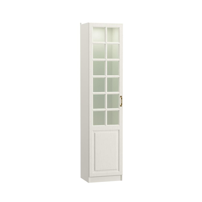 За распашной дверцей шкафа расположены четыре полки, две верхних из которых выполнены из стекла. Верхний горизонт шкафа оснащён врезным спотом для подсветки, что обеспечивает удобство использования.