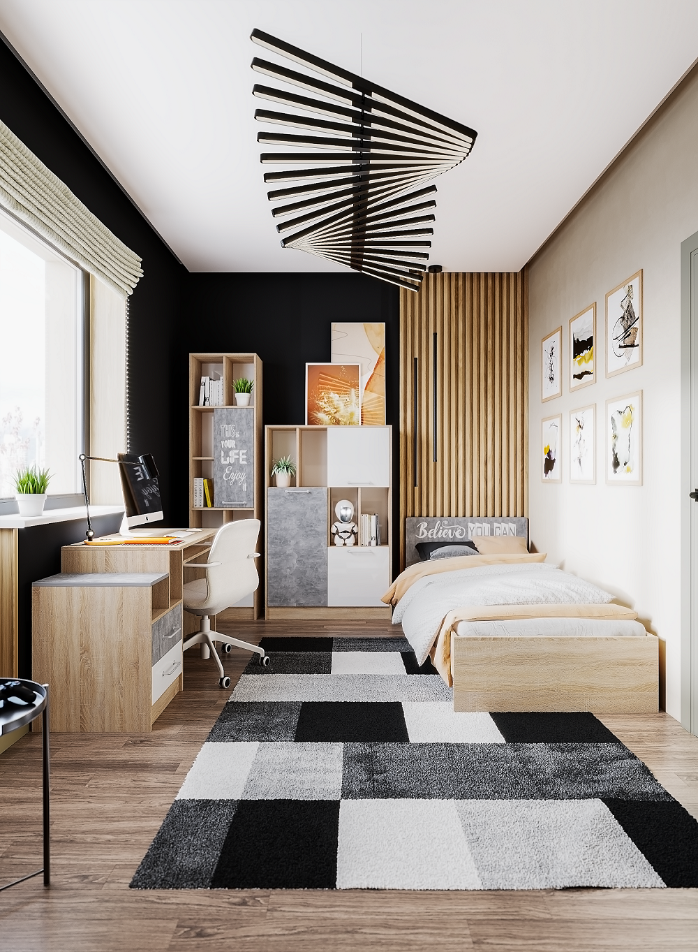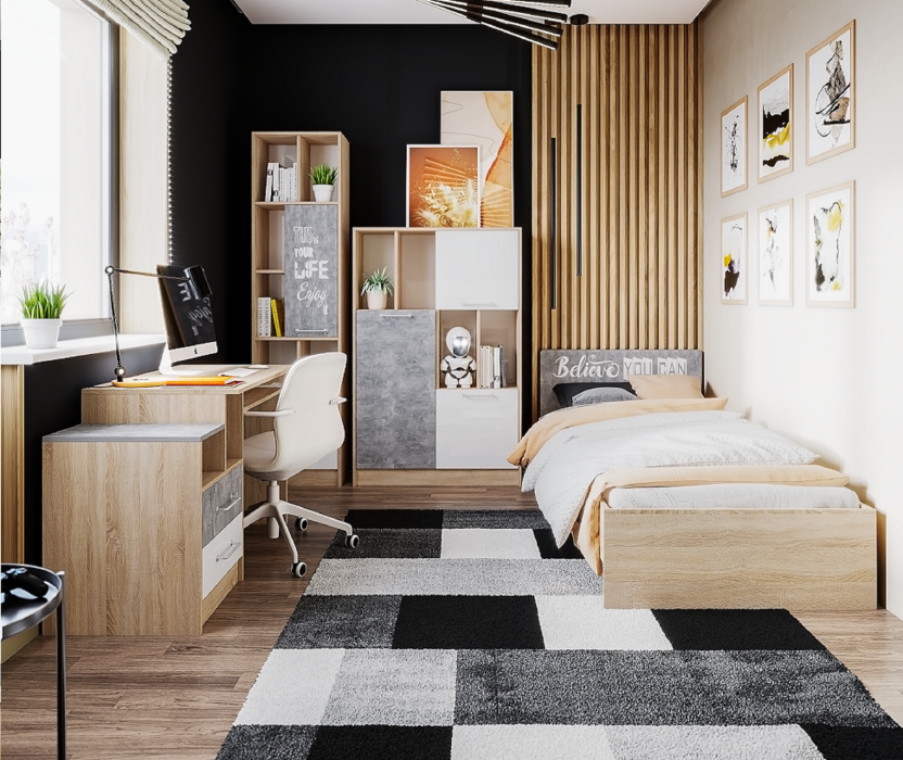 Мебель из коллекции Колибри - универсальное решение для создания детской комнаты как для мальчика, так и для девочки. Сочетание каркаса в цветедуб сонома с декором ателье светлое и белый акрил визуально облегчает интерьер, а рисунок на фасаде мебели, нанесенный методом фотопечати, делает ее оригинальной. Данный комплект прекрасно впишется в компактную комнату и позволит Вам сэкономить площадь за счет функциональности модулей.Комплектуется стильной металлической фурнитурой.
