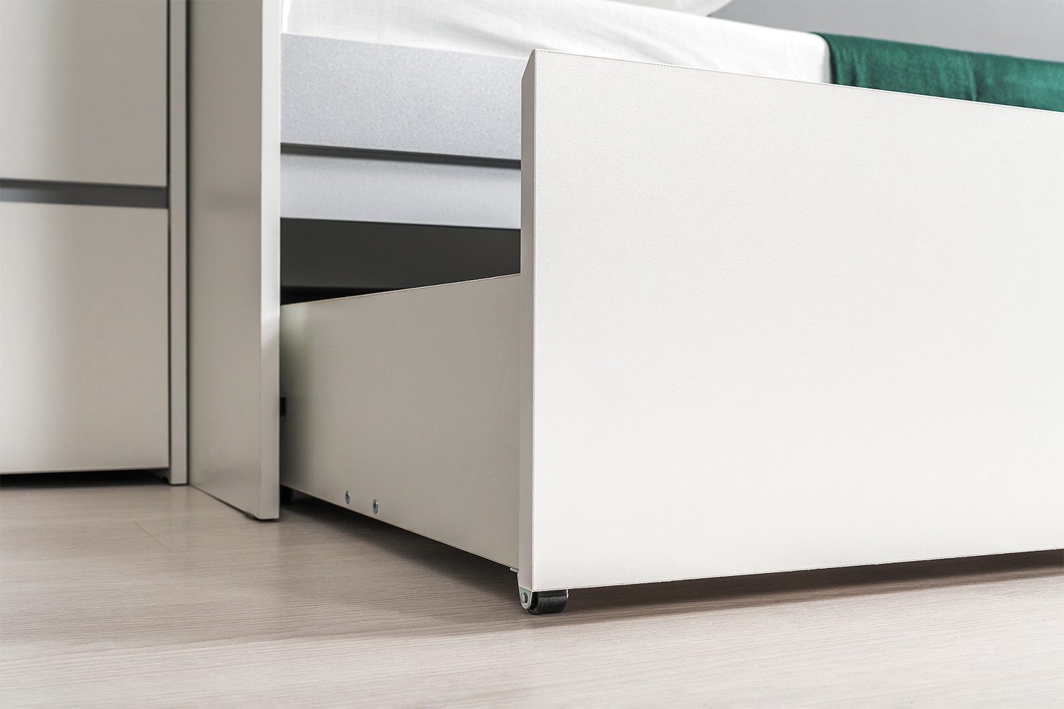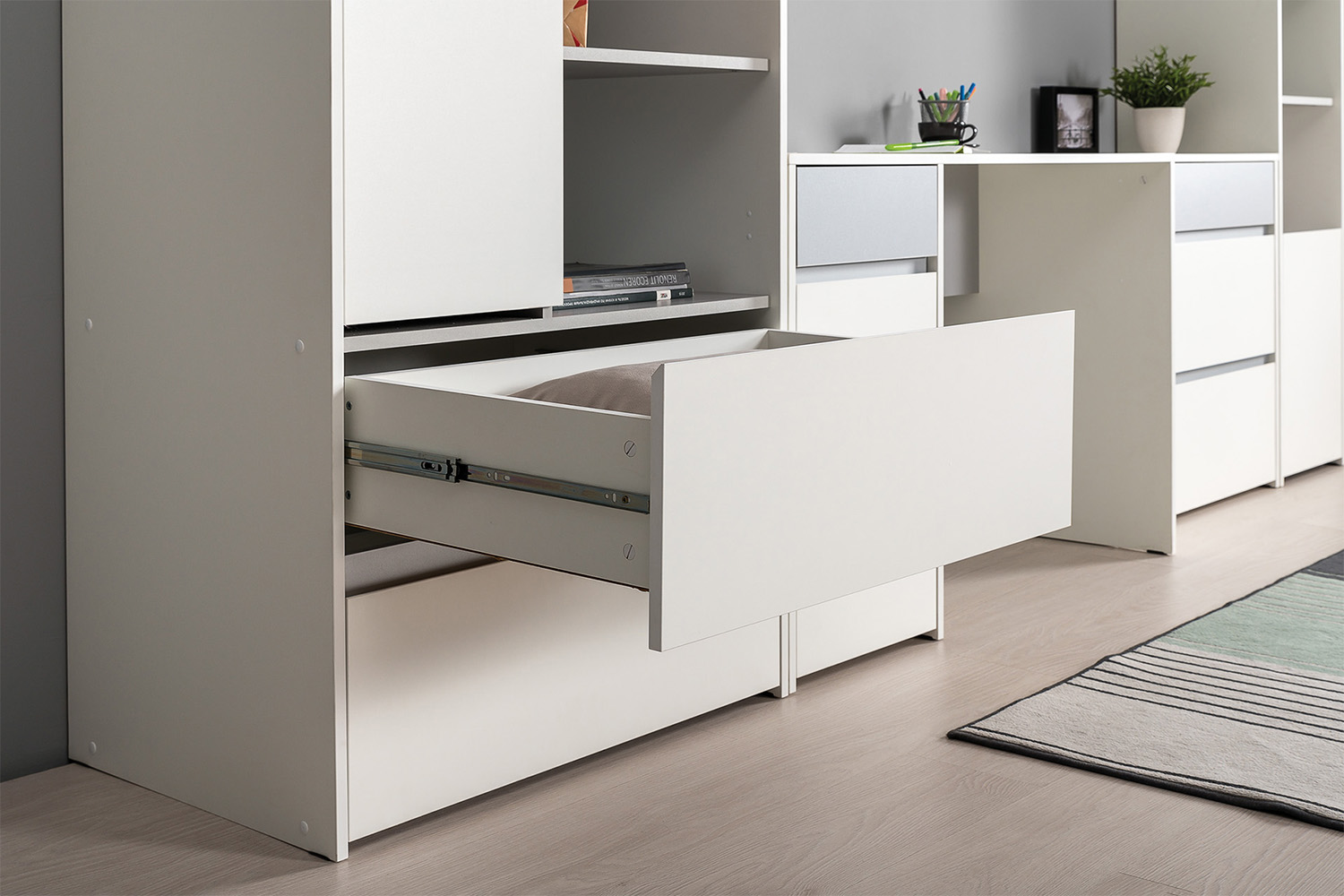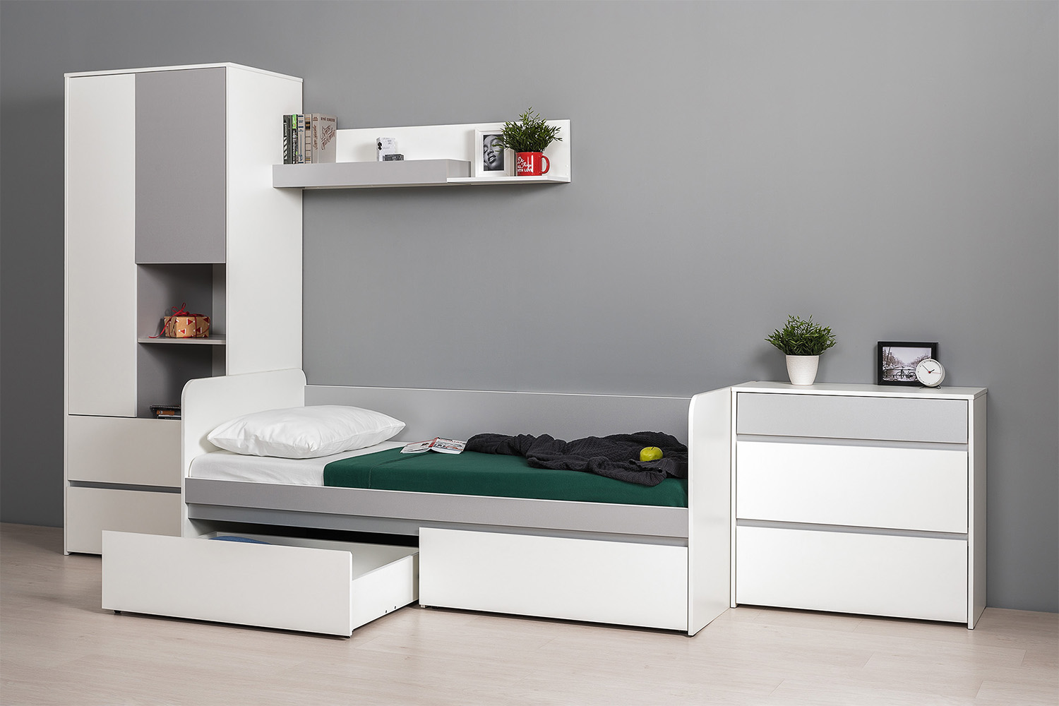 Базовый белый цвет, сочетаясь с акцентным серым, создаёт нейтральную основу интерьера, чтобы подчеркнуть личные вещи и аксессуары.
