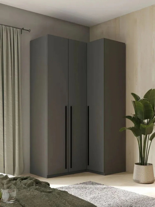 Угловая форма шкафа позволяет использовать даже самые труднодоступные места, что делает его универсальным решением для малогабаритных квартир и домов. Этот шкаф идеально подойдет для спальни, детской или прихожей, легко сочетаясь с другими предметами мебели.