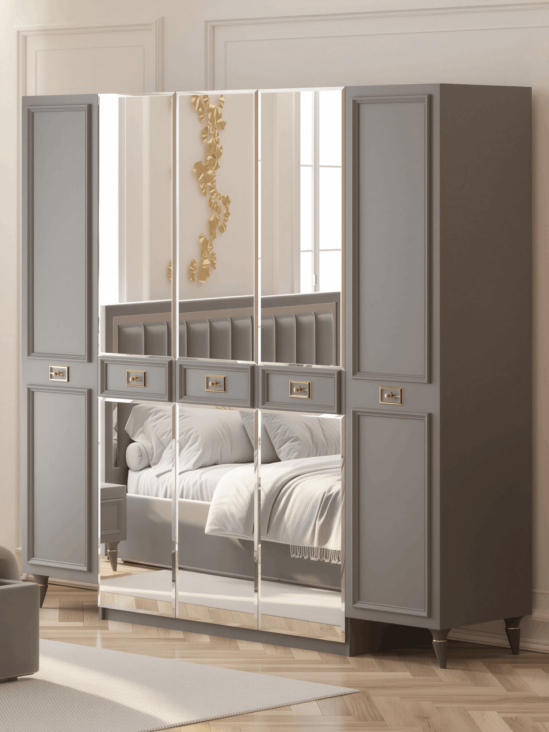 Представляем вам великолепный шкаф для спальни, который не просто мебель, а настоящее произведение искусства в стиле неоклассика. Этот шедевр не только обеспечивает вас максимальным пространством для хранения, но также станет эпицентром изыска и элегантности в вашей спальне.