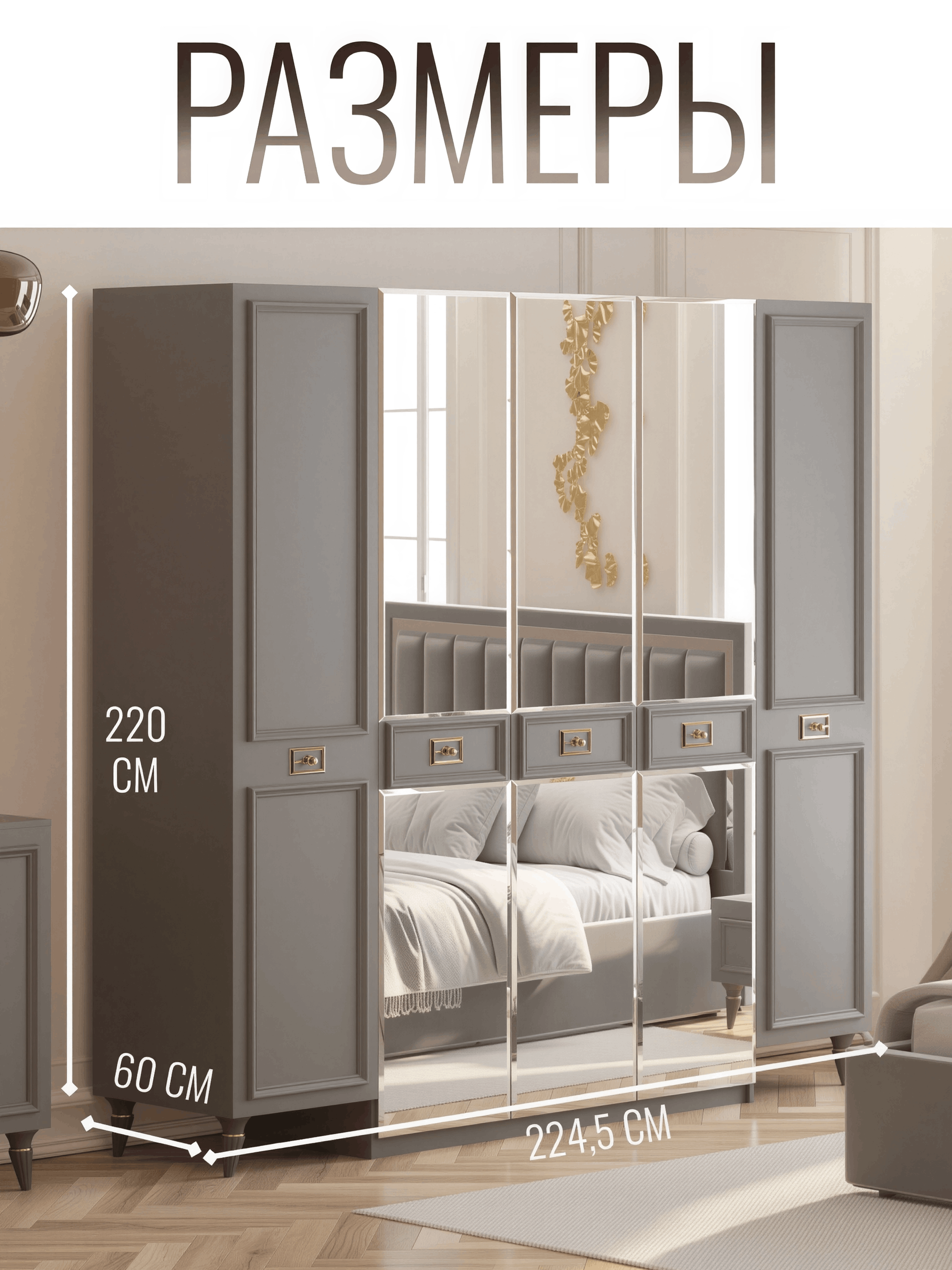 Изысканные Детали: Утонченные линии, резные детали и декоративные элементы создают атмосферу несравненной утонченности и роскоши. Этот шкаф - не просто место для хранения, это произведение искусства, которое придает вашей спальне уникальный характер.