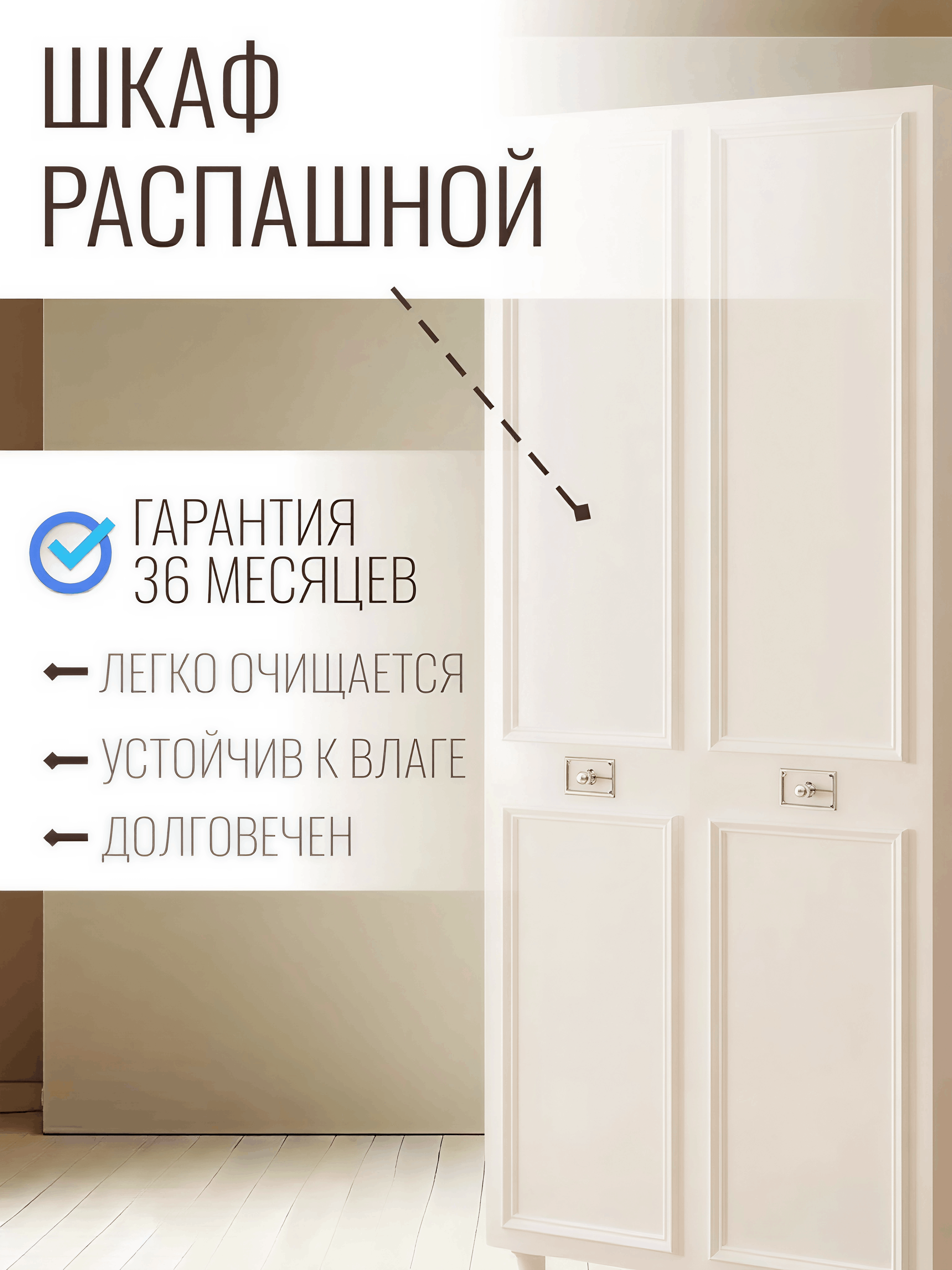 Удобство и Организация: Распашные двери шкафа обеспечивают легкий доступ к вашим вещам. Внутренний объем шкафа разработан с учетом удобства и организации хранения. Полки и вешалки предоставляют максимальную функциональность и эффективное использование пространства.