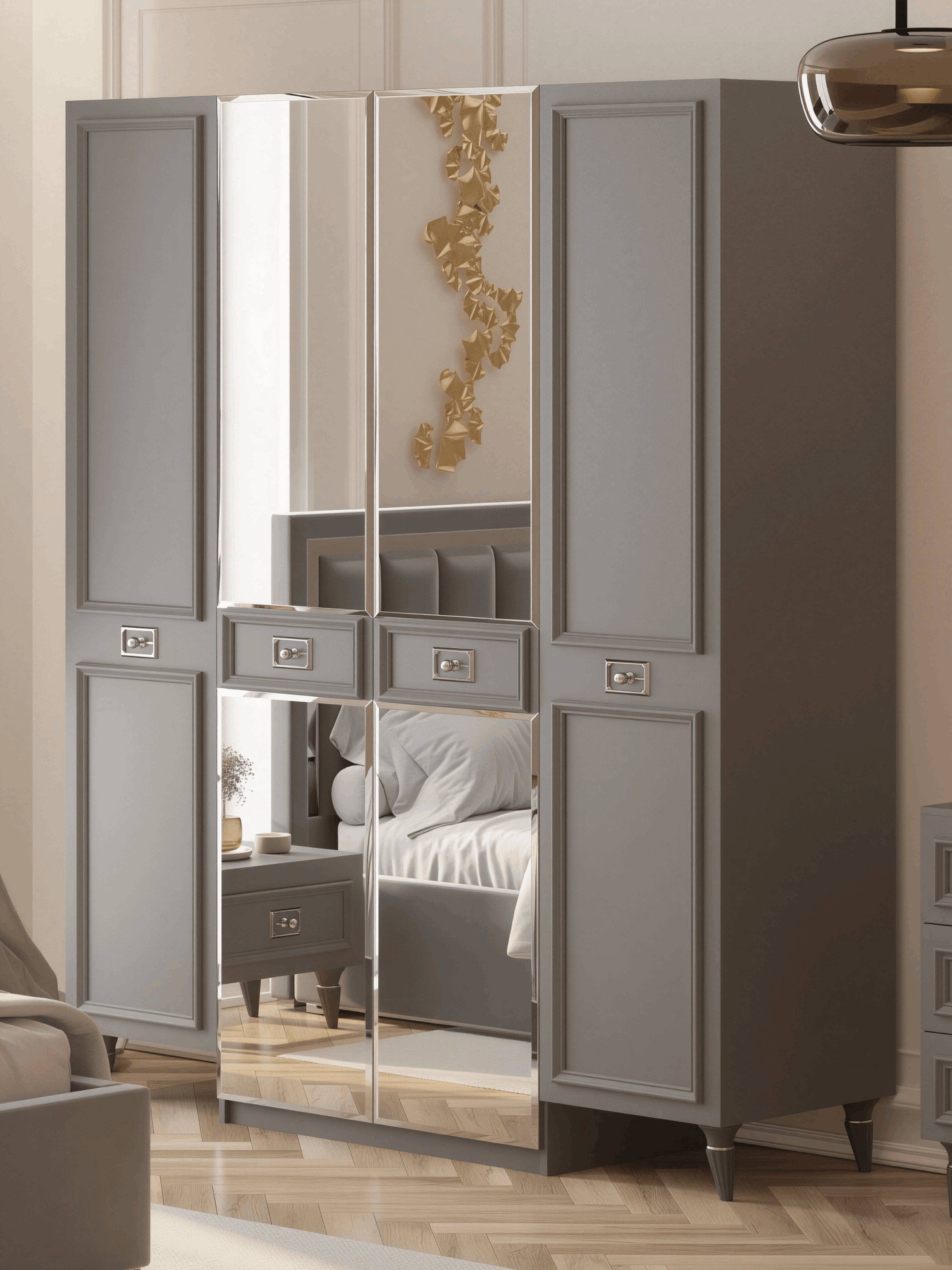 Неоклассический Стиль: С этим шкафом вы возвращаетесь в эпоху изысканных классических форм и изящества. Оригинальный дизайн воплощает в себе лучшие элементы неоклассического стиля, что делает его неотъемлемой частью искусства в вашей спальне.