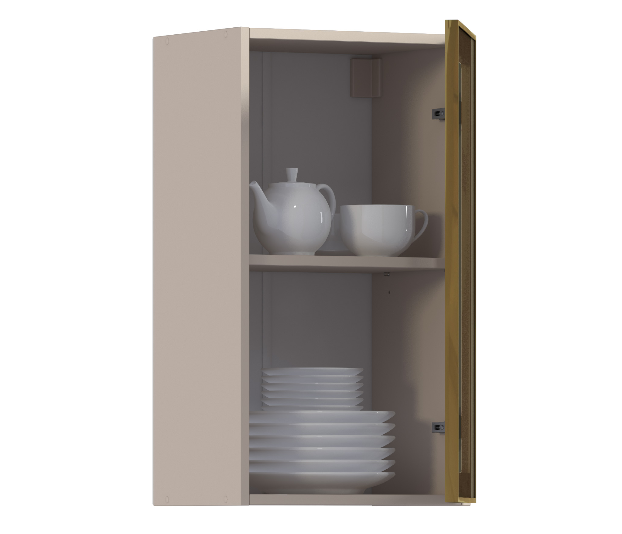 Комплект включает в себя корпус кухонной полки (песочного цвета) с необходимой фурнитурой, фасад из алюминиевой рамки золотого цвета и бронзового стекла, а также ручку, соответствующую цвету рамки фасада.