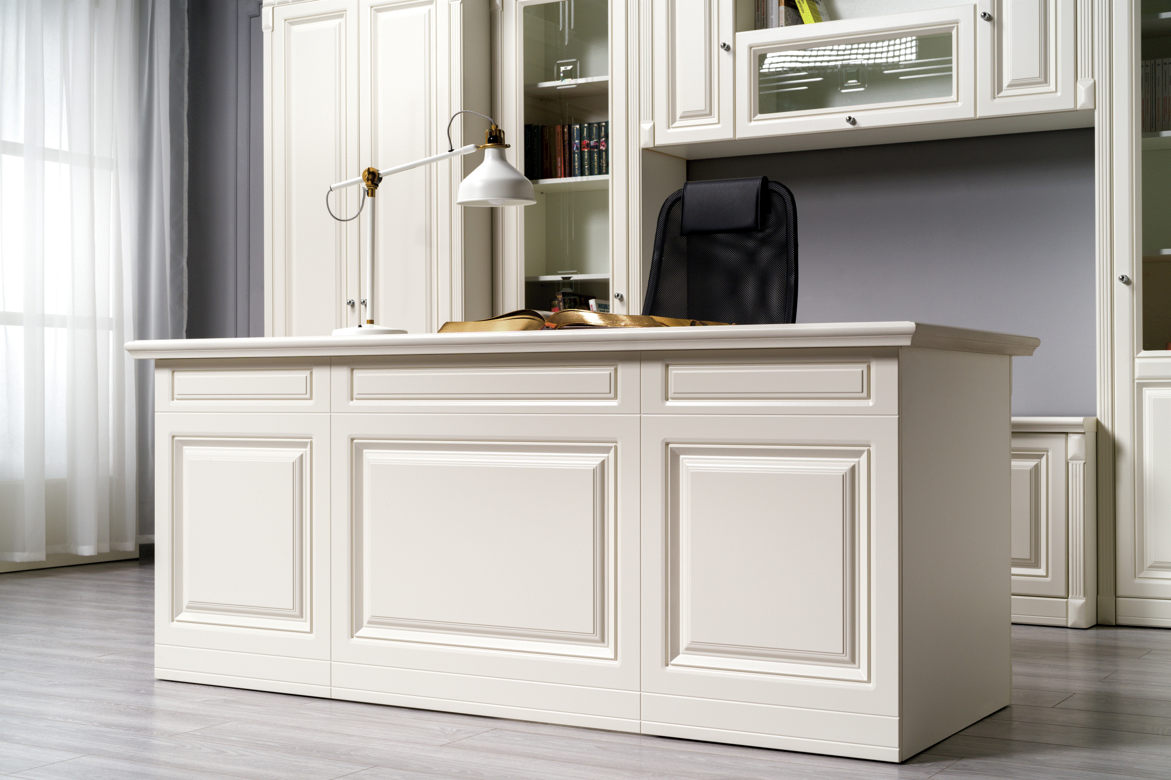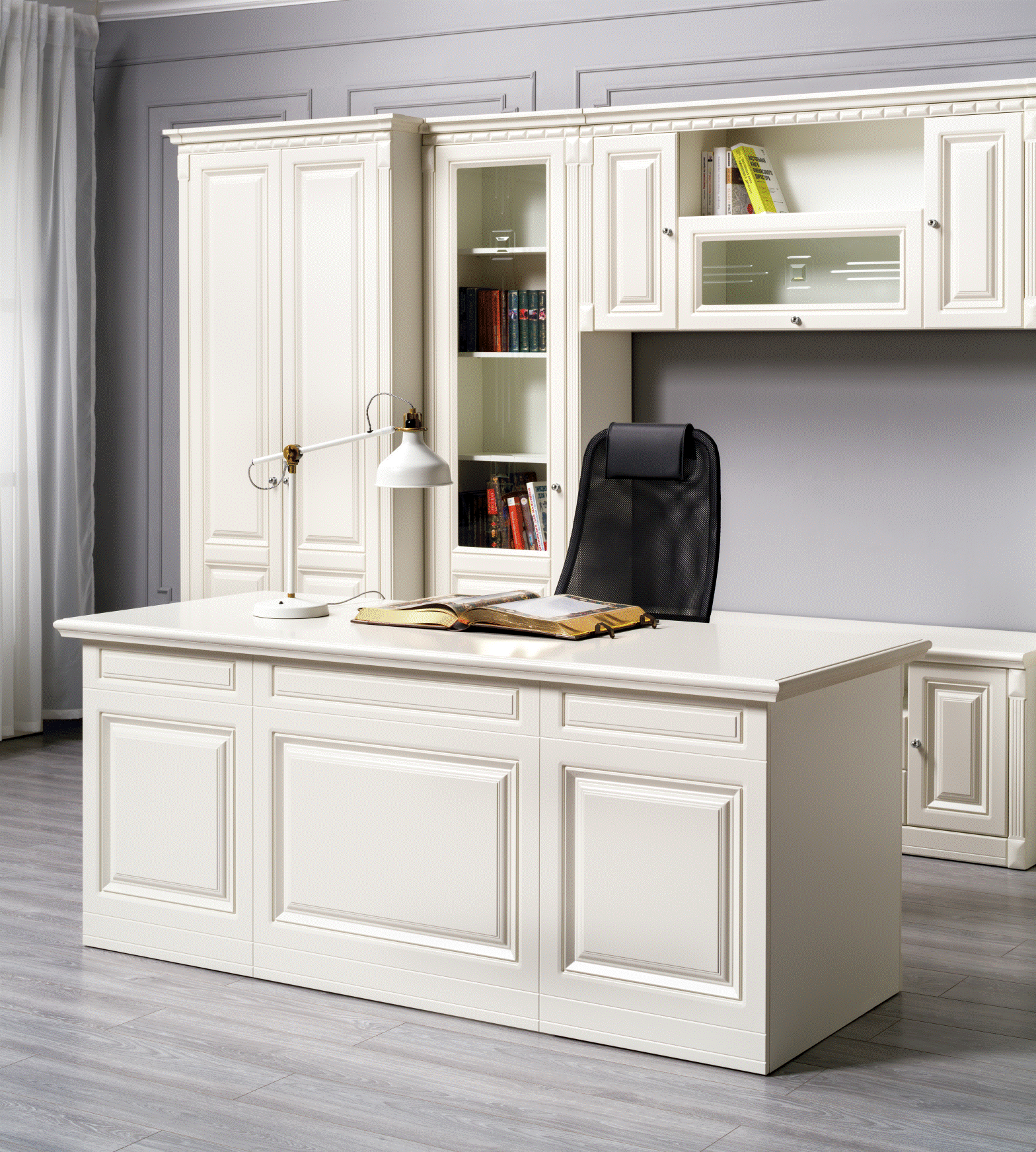 Мебель выполнена из МДФ с 3D-фрезеровкой, его отличают высокая прочность и долговечность, экологичность и безопасность. Две вариации шкафов – с глухим и стеклянным фасадом позволят как разместить книги, сувениры, так и скрыть то, что необходимо от посторонних глаз.