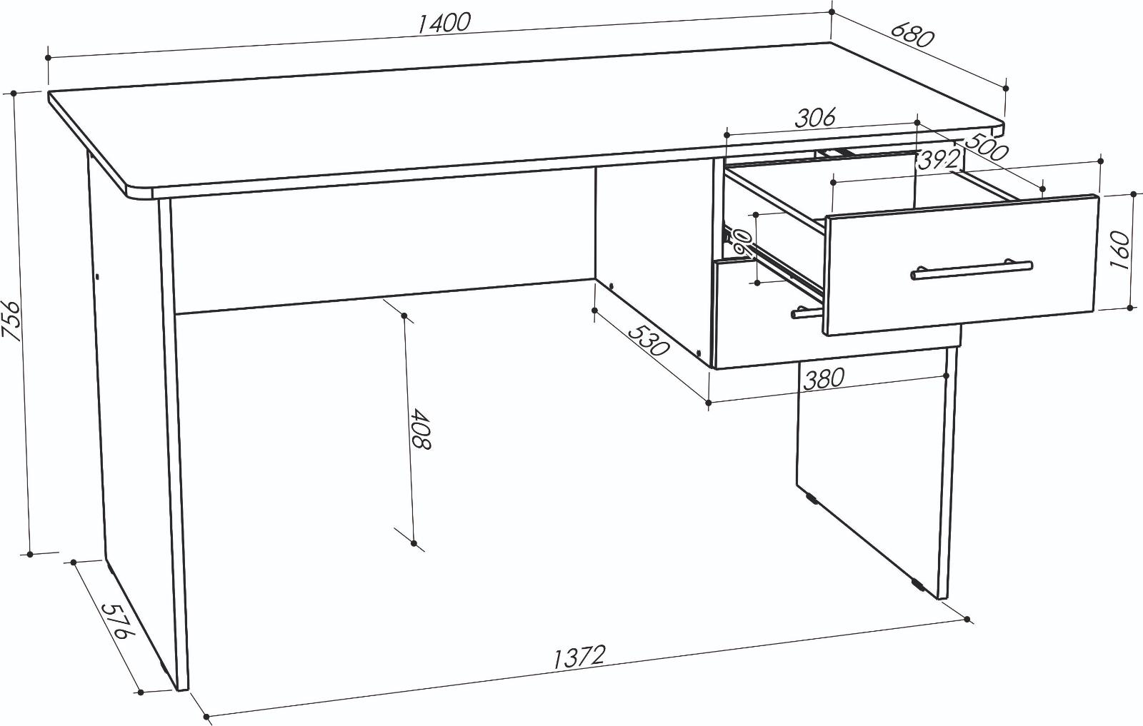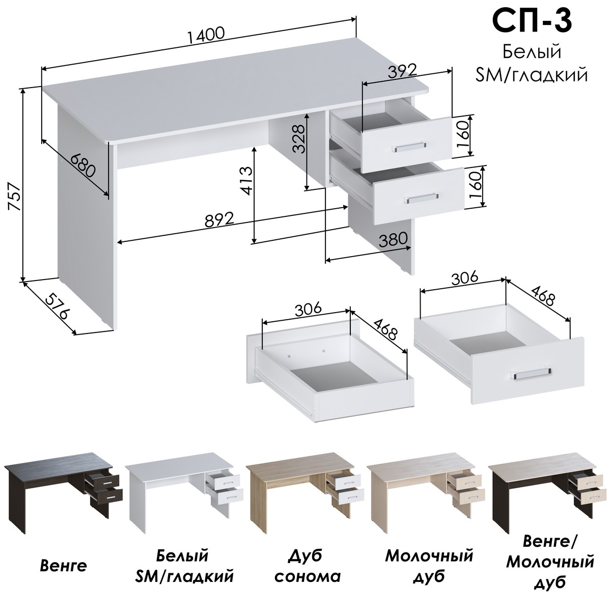 Широкий письменный стол с просторной рабочей зоной 140х68 см. Конструкция с двумя выдвижными ящиками, расположение ящиков справа. Столешница со скруглёнными углами, что повышает травмобезопасность. Кромка переднего края столешницы толщиной 2 мм для комфортной работы за столом. Такой стол отлично подойдёт как для дома так и для офиса. Изготовлен из ЛДСП 16 мм, цвет Дуб сонома/Белый гладкий. Поставляется в разобранном виде.